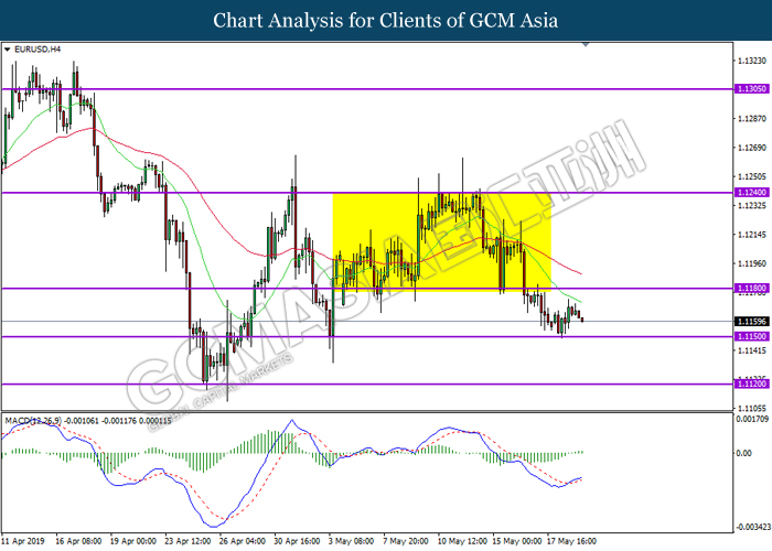 EURUSD, H4: EURUSD was traded lower following prior retracement from the 20-MA line (green). MACD which illustrate bearish bias suggest the pair to extend its retracement towards the support level at 1.1150.