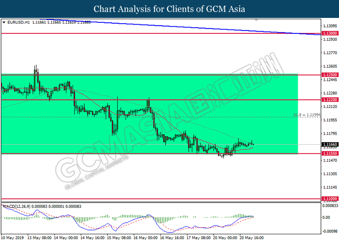 EURUSD, H4: EURUSD was traded higher following prior rebound from the support level of 1.1155. MACD which illustrate bullish signal suggests the pair to be traded higher in short-term as technical correction.