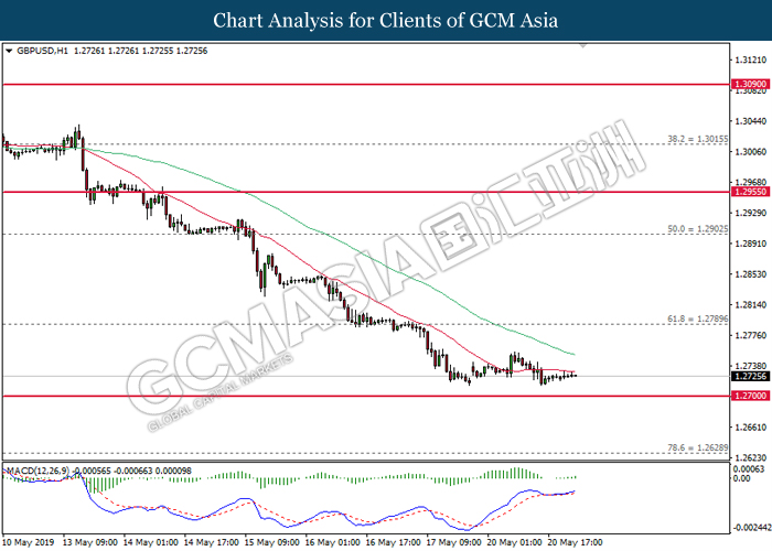 GBPUSD, H1: GBPUSD was traded flat near the support of 1.2700. Due to the lack of signal from MACD and price action, it is suggested to wait for a breakout before entering the market.