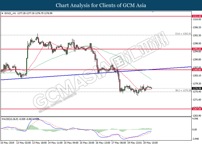 GOLD_, H1: Gold price was traded flat after breaking out from the upward trendline. MACD which illustrate diminishing upward momentum suggests its prices to extend its losses after breaking the strong support near 1275.30.