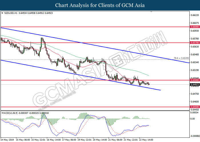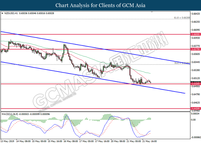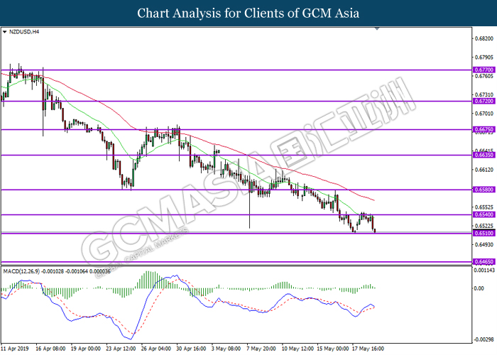 NZDUSD, H1: NZDUSD was traded lower following prior retrace from the 20-MA line (red). MACD which illustrate diminished upward momentum suggests the pair to extend its losses after breaking the support level at 0.6500.