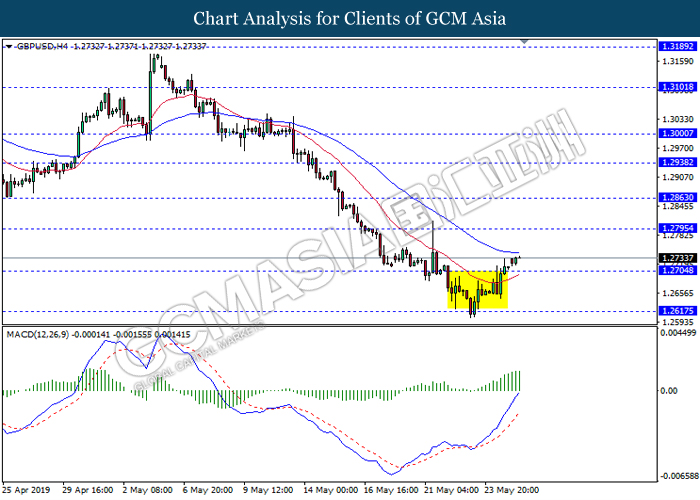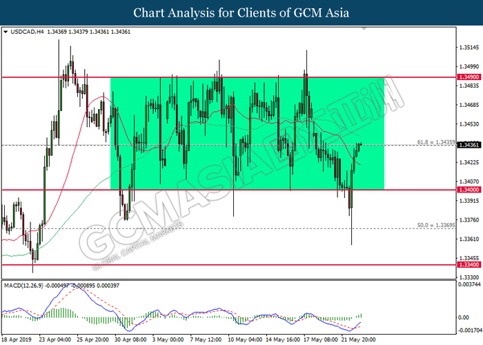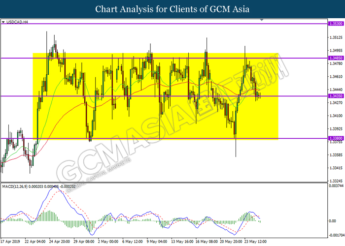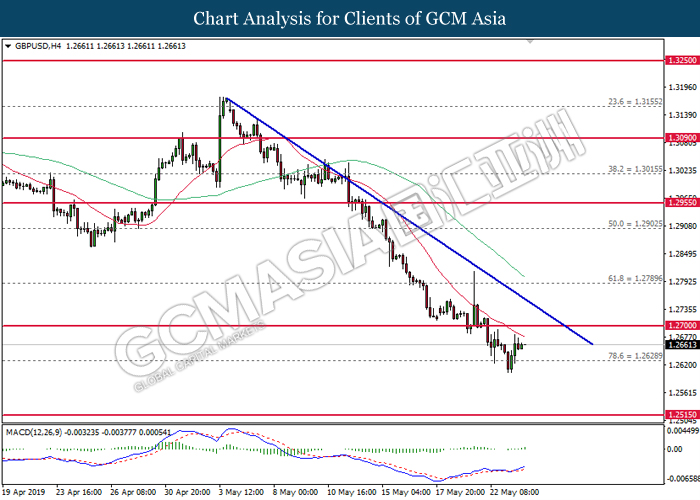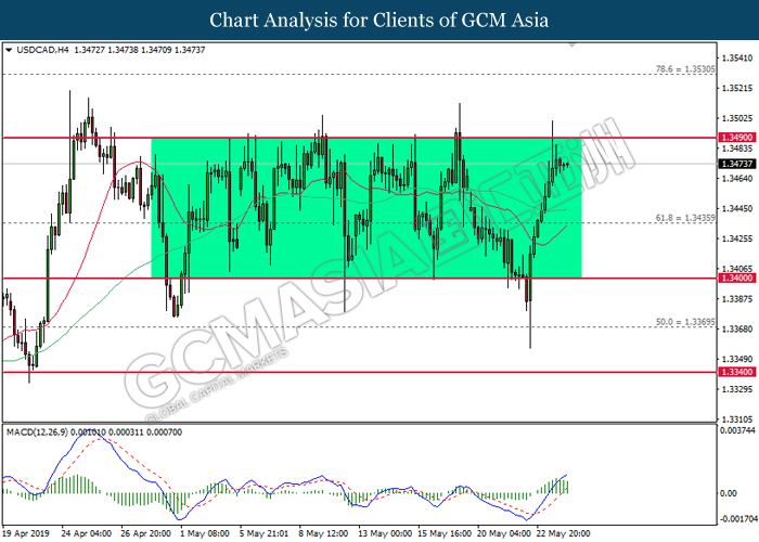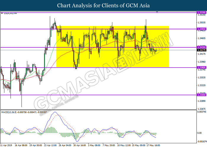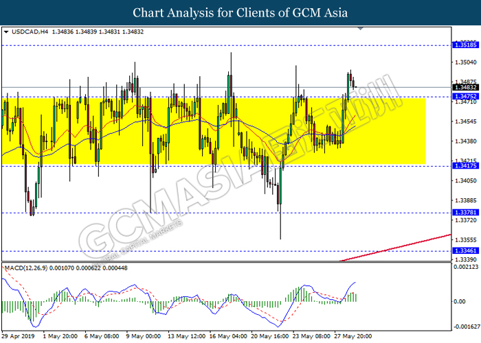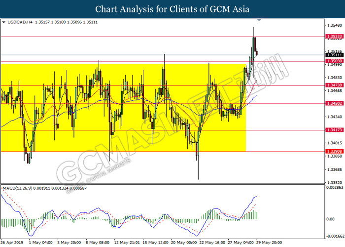Dollar index which gauge its value against a basket of six major currencies surged back to its 1-week high yesterday before retracing 0.04% to 97.95 following major sell-offs in the equity market as US treasury yield curve shows signs of inversion, indicating economy recession. Recent trade war tensions, Brexit uncertainties and global recession had caused investors to place their investment in stronger dollar and safe-haven assets, boosting dollar’s appeal as investors await further signals in the market. Besides that, increasing tensions between US-Sino trade war continue to weigh on oil prices while heightening expectations of lower oil demand in the market. The major fall in crude oil price also further pressured the Loonie, causing the pair of USD/CAD to hit its January high. Besides that, Bank of Canada kept its interest rate unchanged yesterday, while hinting that overall economy in the Canada is in line with the bank’s expectation. However, they will still focus on upcoming data to decide on future rate changes. The pair of USD/CAD inched lower by 0.04% to 1.3512 as of writing.