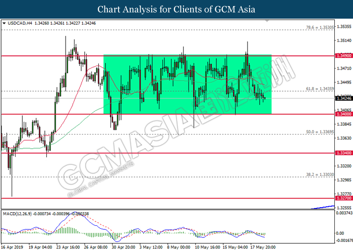 USDCAD, H4: USDCAD remain traded in a sideway channel after breaking below the previous support level 1.3435. MACD which illustrate bearish momentum suggest the pair to extend its losses towards the bottom-level of the channel at 1.3380.