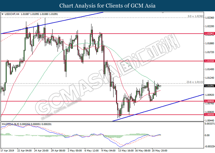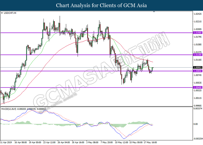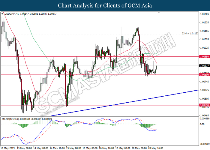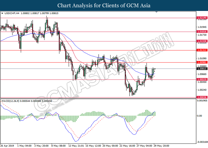 USDCHF, H1: USDCHF was traded higher following prior rebound from the support level of 1.0080. MACD which illustrate bullish signal suggests the pair to be traded higher in short-term, towards the direction of 1.0095.