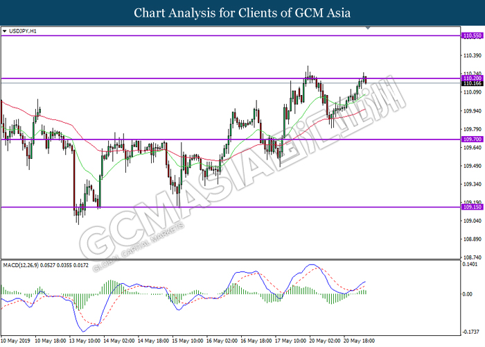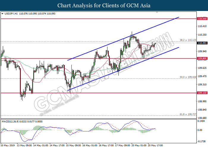 USDJPY, H1: USDJPY was traded higher following prior rebound from the lower level of the upward channel. MACD which begins to form a golden cross signal suggests the pair to extend its gains after closing above 110.10.