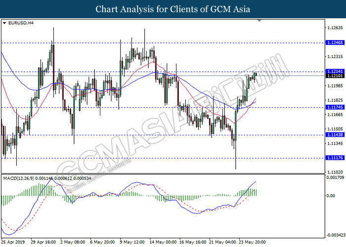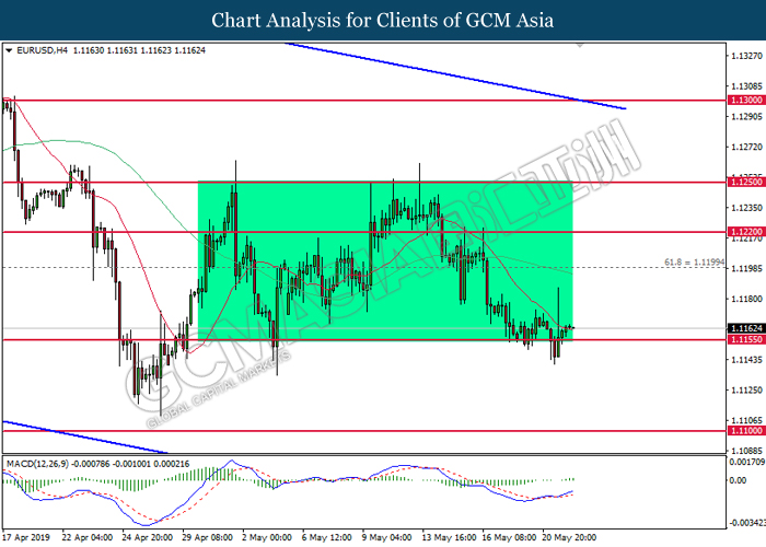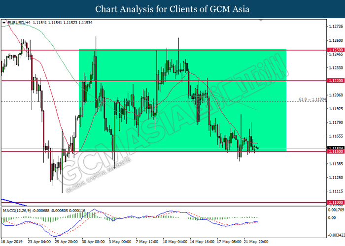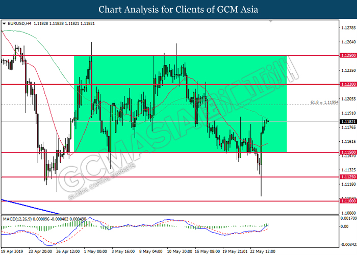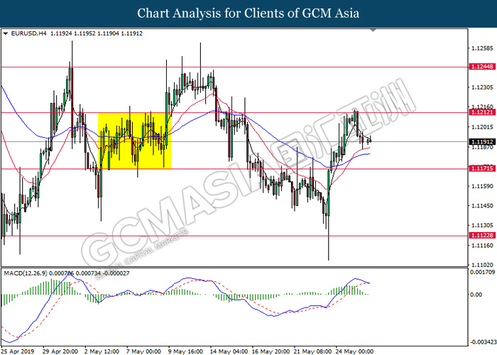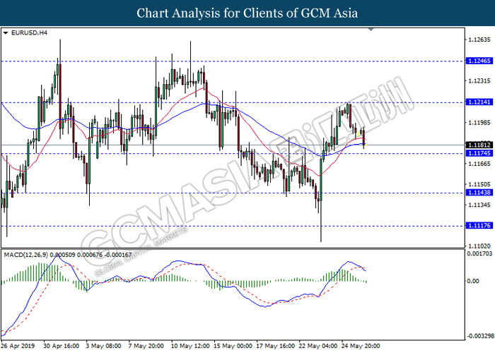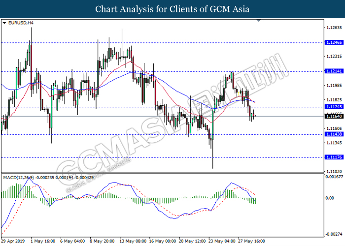 Greenback received higher bidding as market participants digests US President Donald Trump’s comment with regards to trade with China. Prior, Trump who was speaking in a joint news conference in Tokyo with Japan PM Shinzo Abe said that US is not ready to forge a deal with China. He also added that prior tariff of 25% could be increased to the target of 35% substantially. Due to ongoing trade spat between both nations, market participants shift their portfolio into safe-haven assets which also includes US Treasuries. Overall, the upcoming G20 summit which will be held on 28th – 29th June in Osaka remains as the main limelight whereby US President Donald Trump may initiate talks with China President Xi Jinping. On the other hand, euro received substantial bearish pressure on yesterday due to rising political and economic risk in the region. EU leaders is set to begin the process of filling a number of top EU posts which may affect the future direction of the entire bloc. As of writing, the dollar index ticks up 0.03% to 97.75 while pair of EUR/USD depreciates by 0.03% to 1.1166.