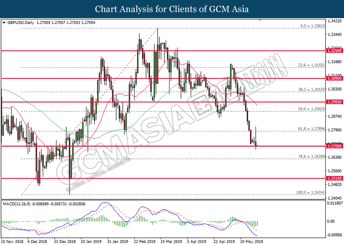 GBPUSD, Daily: GBPUSD was traded lower while currently testing at the support of 1.2700. MACD which illustrate bearish signal suggests the pair to extend its losses after closing below the target of 1.2700.