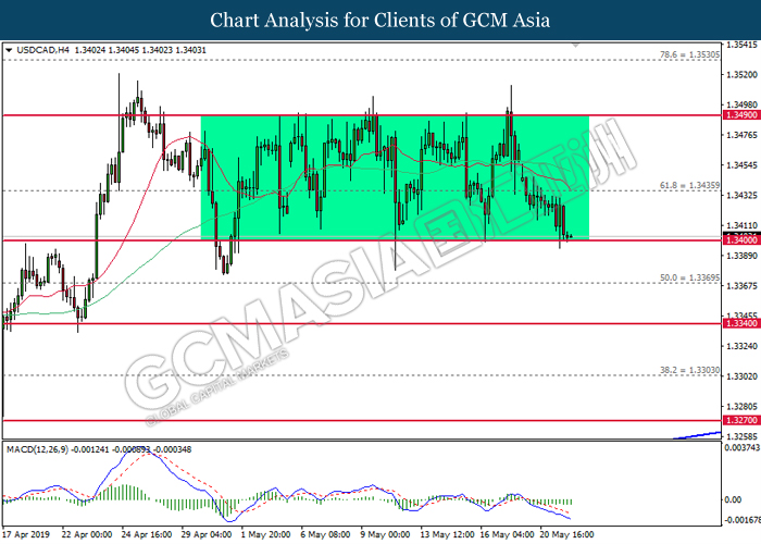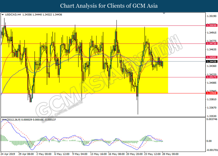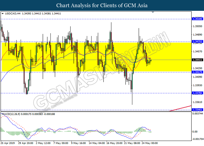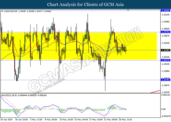USDCAD, H4: USDCAD was traded within a sideways channel while recently closed below 1.3435. MACD which illustrate bearish signal suggests the pair to advance further down, towards the direction of 1.3400.