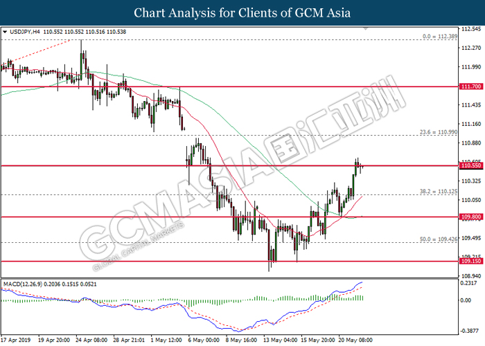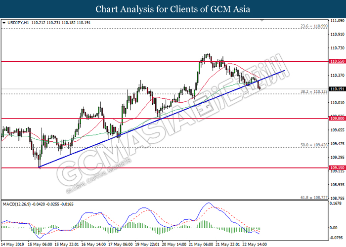 USDJPY, H4: USDJPY was traded lower following prior retracement from the resistance of 110.55. MACD which begins to illustrate diminishing upward momentum suggests the pair to be traded lower in short-term as technical correction.