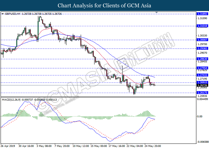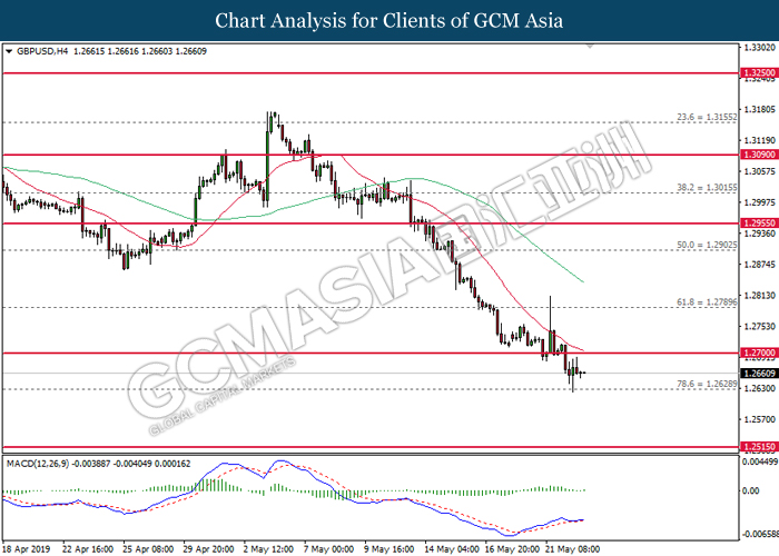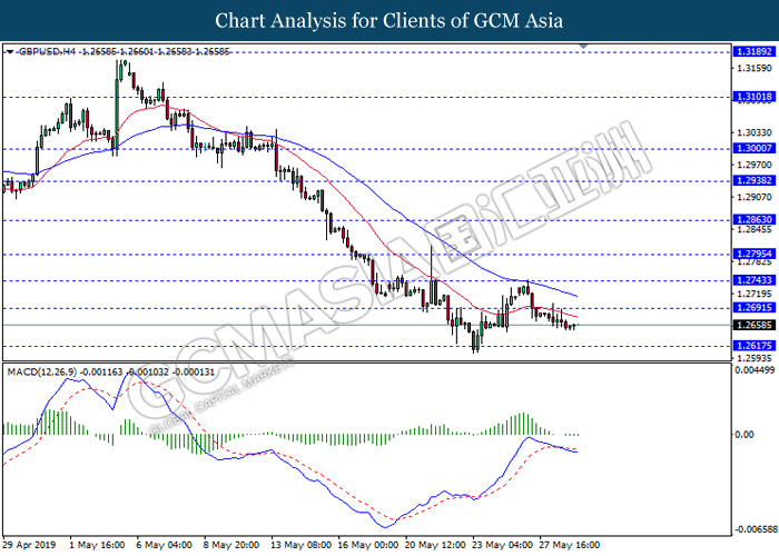GBPUSD, H4: GBPUSD was traded lower following prior retracement from the resistance level 1.2690. MACD which display bearish momentum with the formation of death cross suggest the pair to extend its losses towards the support level 1.2615.