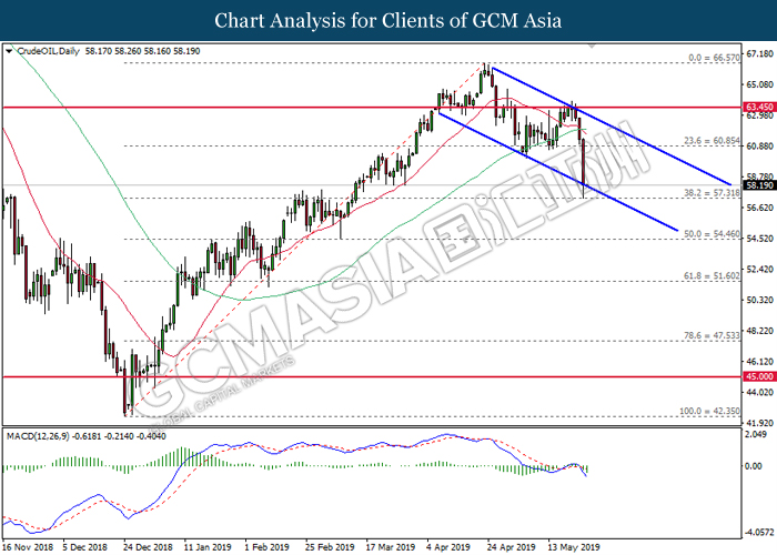 As for commodities market, crude oil price quoted down 0.59% to $58.66 per barrel amid Nigeria’s government recent approval of a new crude oil export terminal in Niger Delta. Before this, Nigeria has announced that they are dusting off an ambitious plan to double its oil production by 2025 and resulted further deterioration in crude oil market sentiment. Besides, gold price quoted up 0.08% to $1280.45 a troy ounce amid markets shied away from riskier asset.