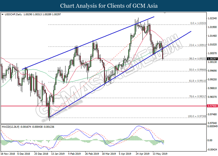 USDCHF, H4: USDCHF was traded lower following prior retrace from its higher levels. MACD which illustrate diminished upward momentum suggests the pair to be traded lower in short-term as technical correction.