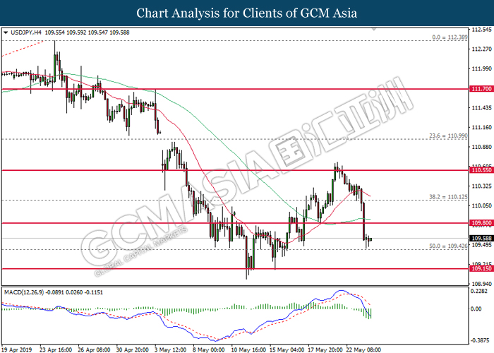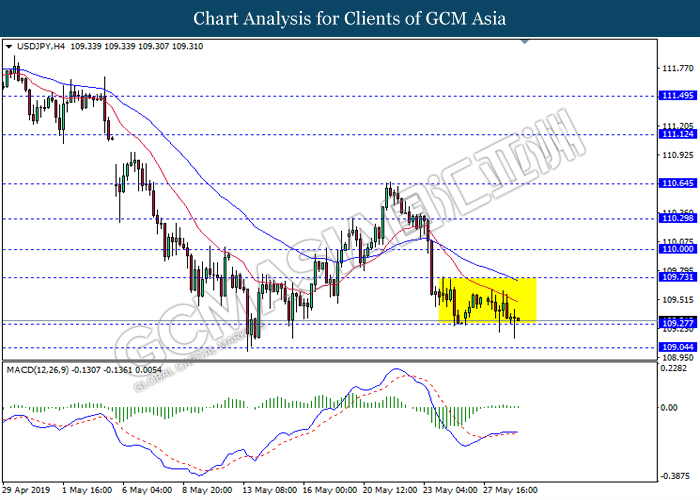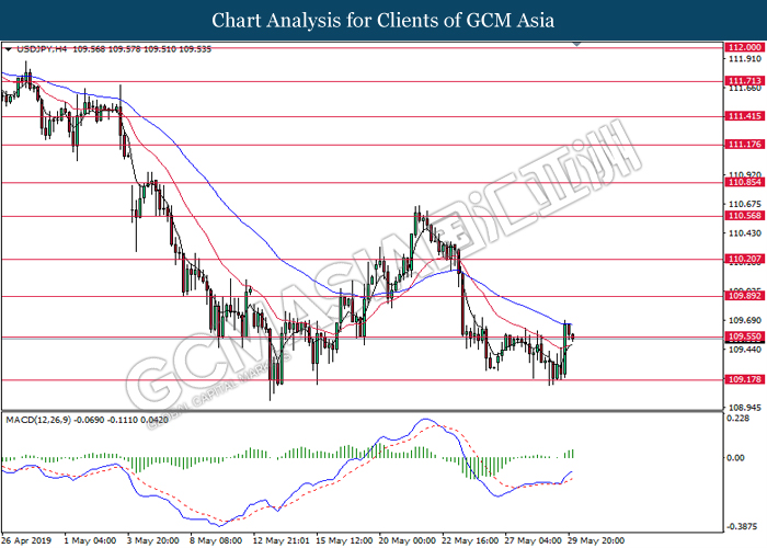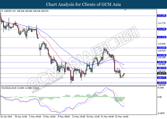 USDJPY, H4: USDJPY was traded lower while currently testing the support level at 109.55. MACD which illustrate diminishing bullish momentum suggests the pair to extend its losses after closing below the support of 109.55.