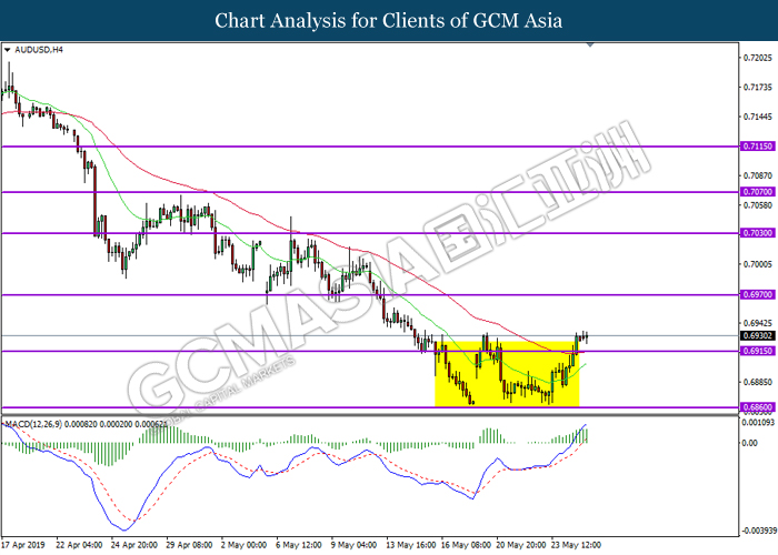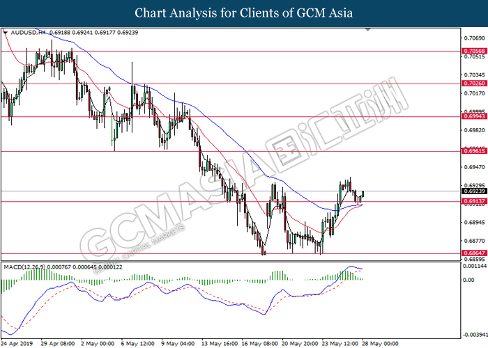 AUDUSD, H4: AUDUSD was traded lower following prior retracement from the downward trendline. MACD which illustrate bearish signal suggests the pair to be traded lower in short-term after closing below 0.6915.
