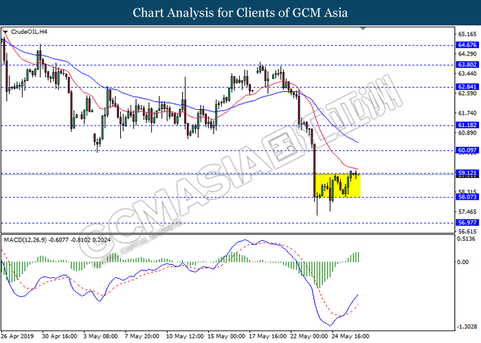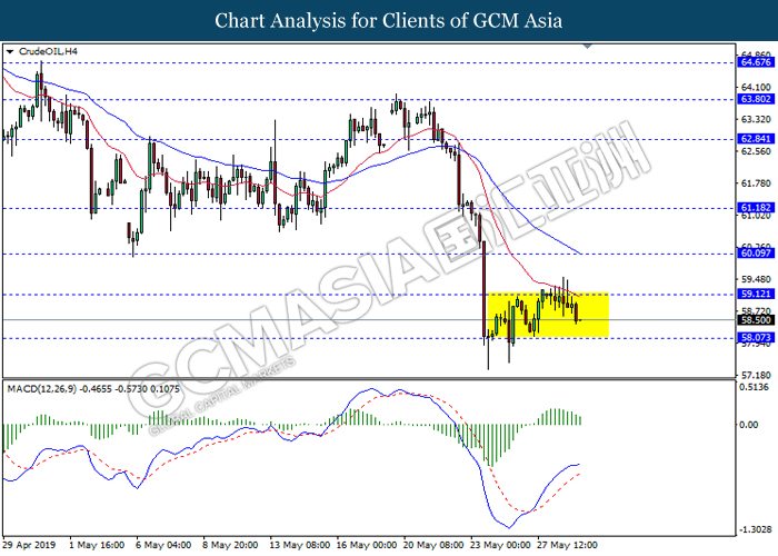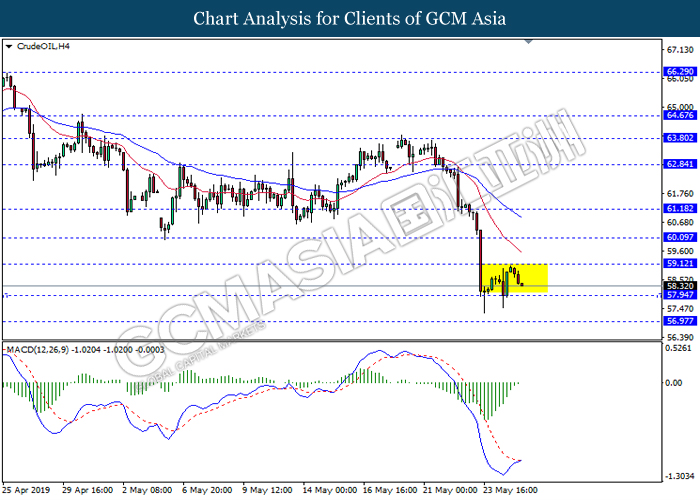 CrudeOIL, H4: Crude oil price remain traded in a sideway channel following recent retracement from the resistance of 59.10. MACD which illustrate diminishing bullish momentum suggest the commodity to extend its retracement towards the support level 58.05.