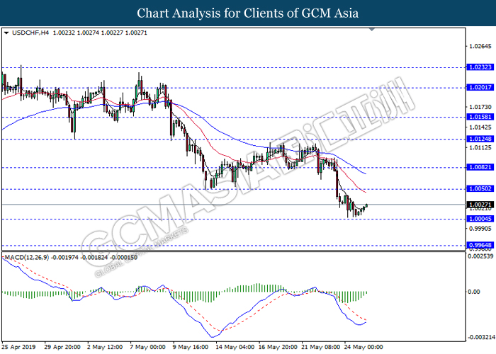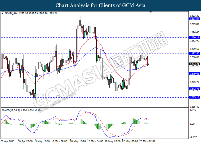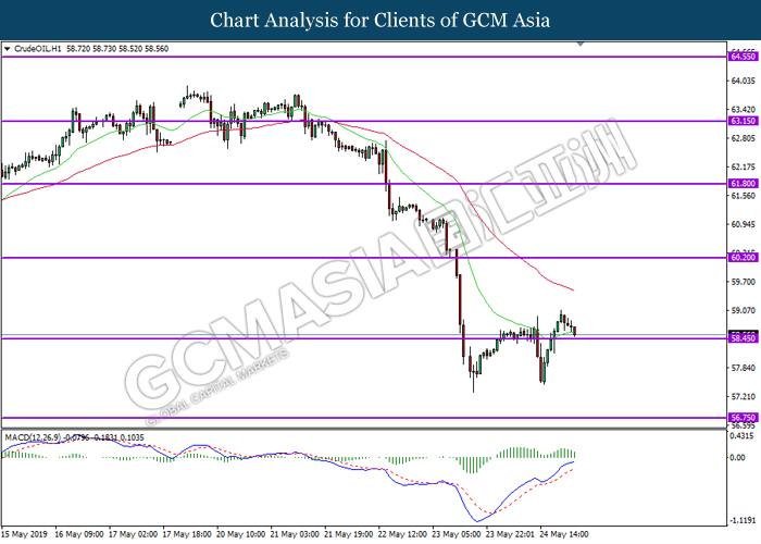 As for commodities market, crude oil price slumped 0.95% to $58.41 per barrel. Oil price fell during mid Asian trading session as ongoing trade war between US and China may trigger global economic recession that could reduce oil demand in the future. Otherwise, gold price depreciates by 0.02% to $1,279.69 a troy ounce due to stronger greenback.