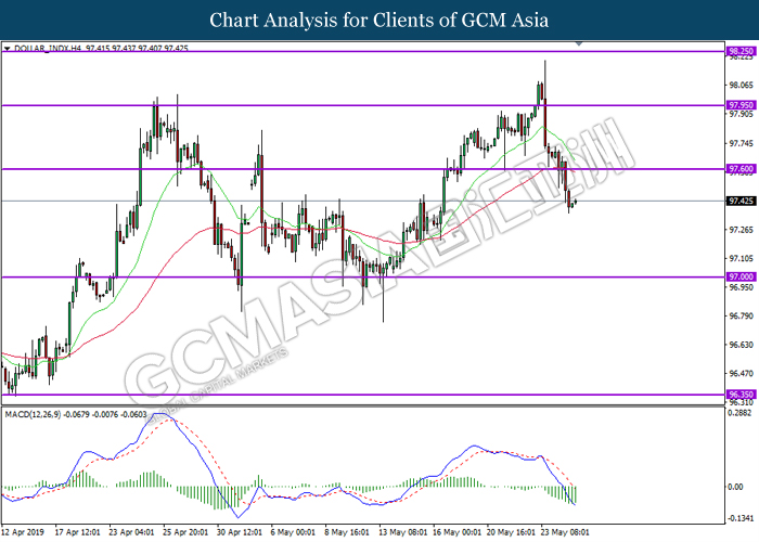 DOLLAR_INDX, H4: Dollar index was traded lower following prior retrace from the resistance of 97.95. MACD which begins to form a bearish signal suggests the index to be traded lower in short-term as technical correction.