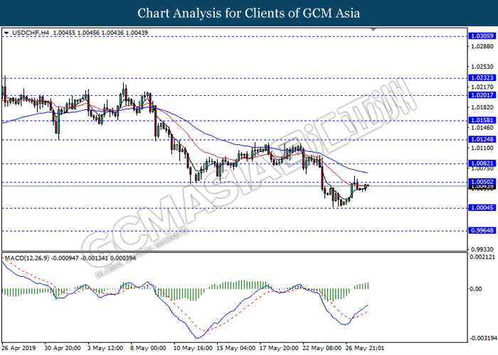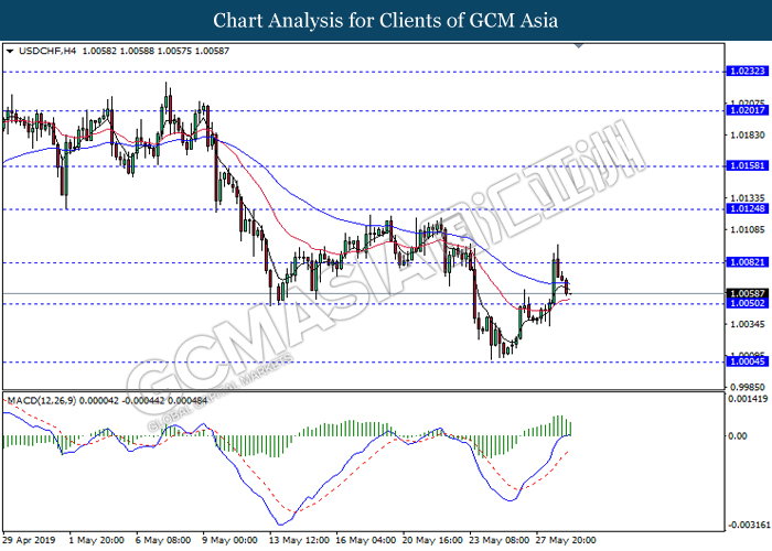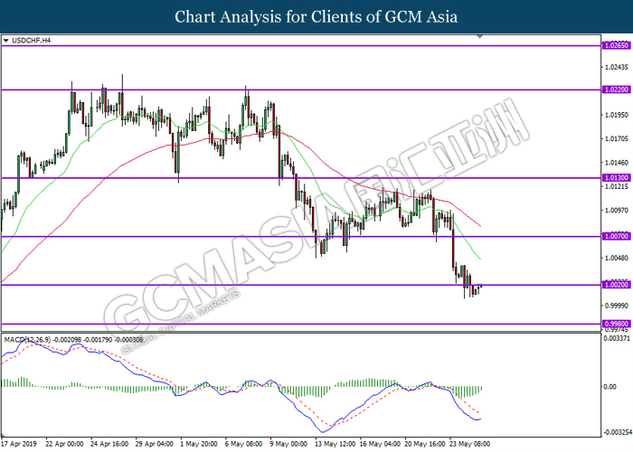 USDCHF, H4: USDCHF was traded lower following prior retracement from the resistance level 1.0080. MACD which illustrate bearish bias signal suggest the pair to extend its retracement towards the support level 1.0050.