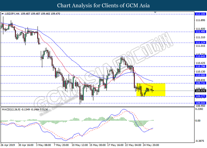 USDJPY, H4: USDJPY remain traded in a sideway channel while currently testing the support level 109.25. However, due to lack of momentum and direction from MACD, a breakout above the resistance level 109.75 or below the support level 109.25 is required to attain further confirmation before entering the market.