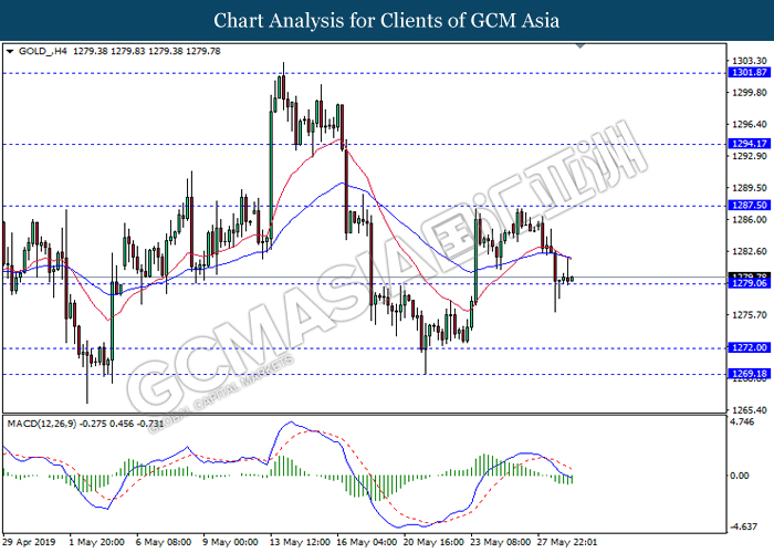 GOLD_, H4: Gold price was traded lower following prior retracement from the higher level. MACD which illustrate bearish bias momentum suggests its prices to extend its losses toward the support level at 1278.45.
