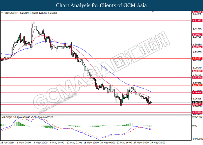 GBPUSD, H4: GBPUSD was traded lower while currently testing the support level at 1.2610. MACD which illustrate bearish signal suggests the pair to extend its losses after successfully breakout below the support level at 1.2610.