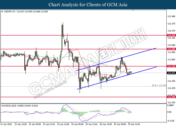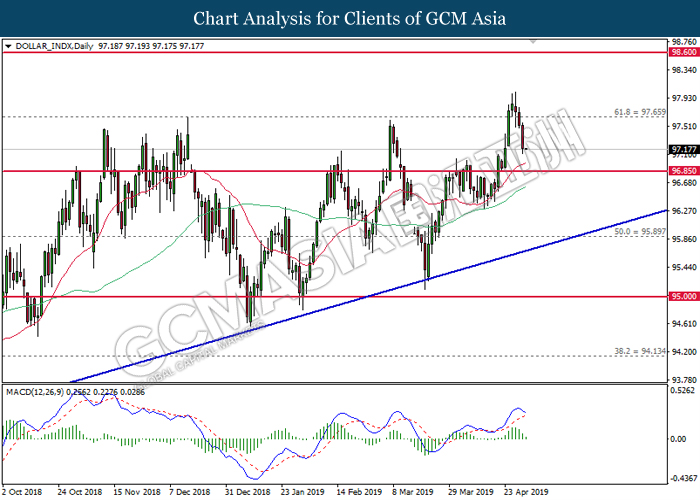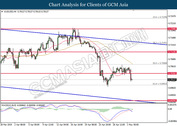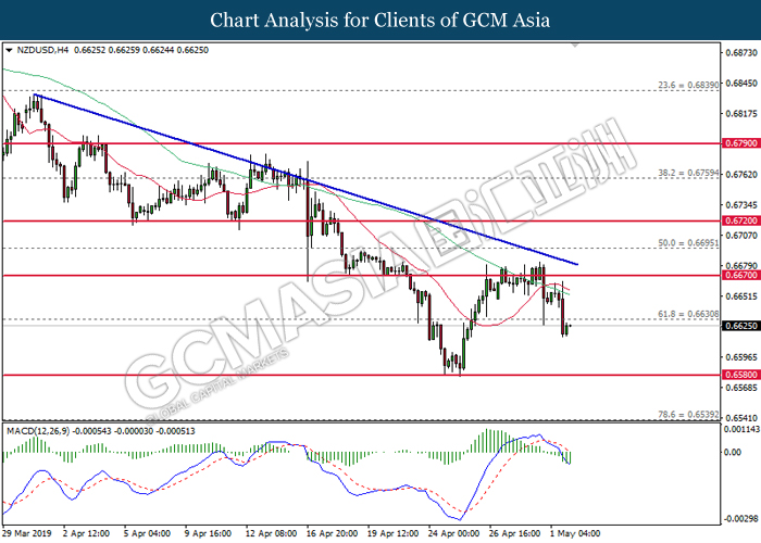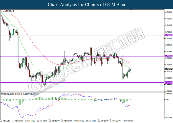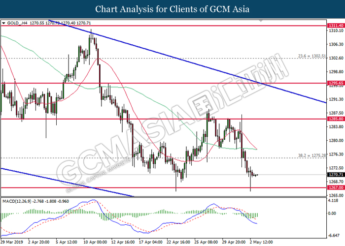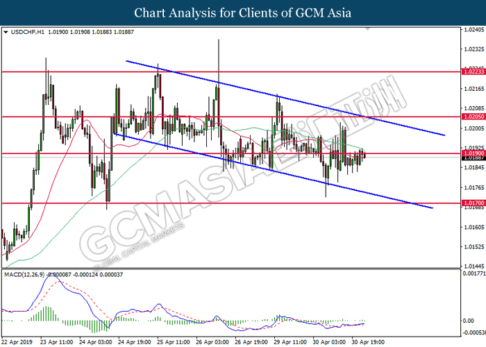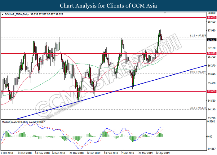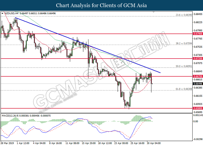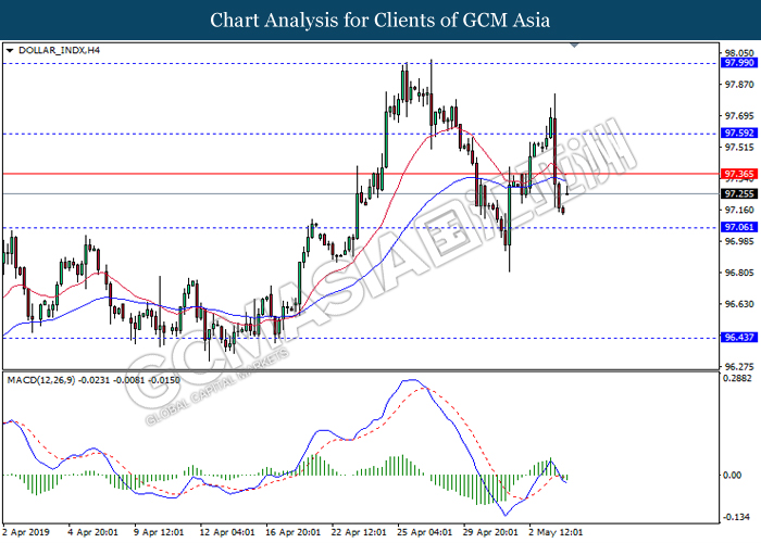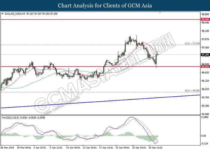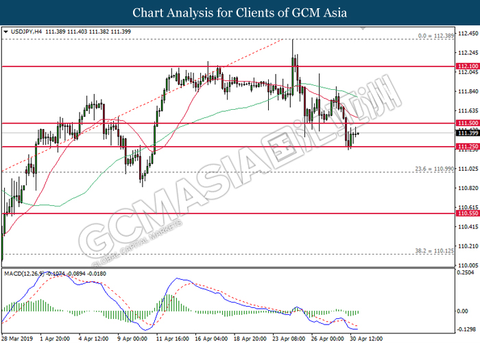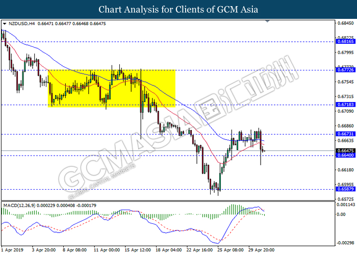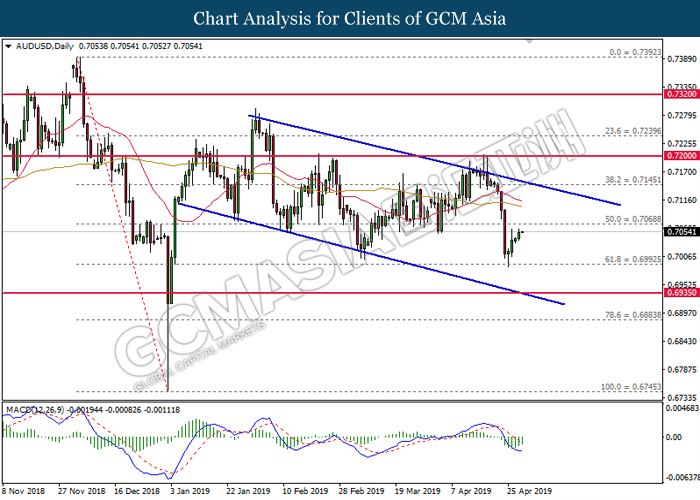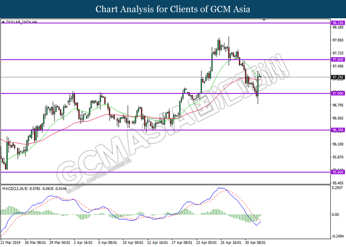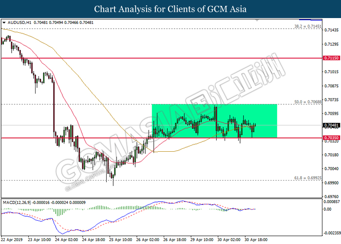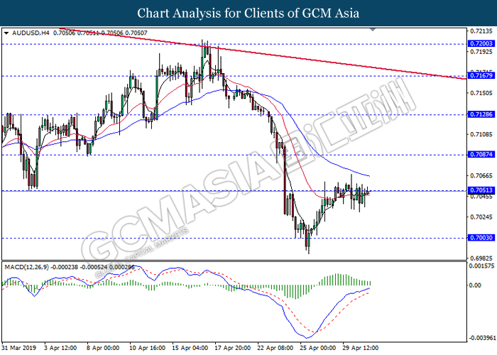 Dollar index continue to fell against its basket of six major currency pairs as market remains pressured by weak consumption figures. Overall, market is currently digesting disappointing data from US after personal consumption expenditures (PCE) (which is the Fed’s preferred inflation measurement) fell to 1.6%, missing economist expectation for a rise of 1.7%. As the Federal Open Market Committee meeting is expected to be held this week, investors’ attention will be centered towards the meeting and Fed Chairman Jerome Powell’s press conference where they expected to result in a decision to leave its key federal funds rate unchanged. Dollar index extend its losses by 0.05% to 97.50 as of writing. On the other hand, AUD/USD suffered huge losses and fell 0.18% to 0.7043 at the time of writing following downbeat China PMI. According to Markit Economics, China factory activity have slumped to 50.2, weaker than market expectation with the expected reading of 51.0. The below-forecasted data have illustrate that China’s economy have barely expanded in April, hinting economic slowdown, therefore dragging the Aussie which is China’s largest trading partner.