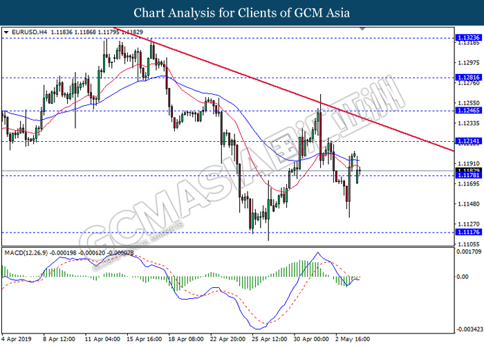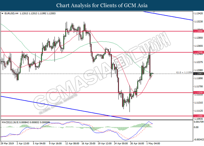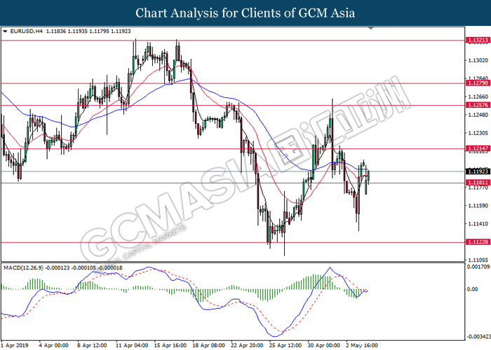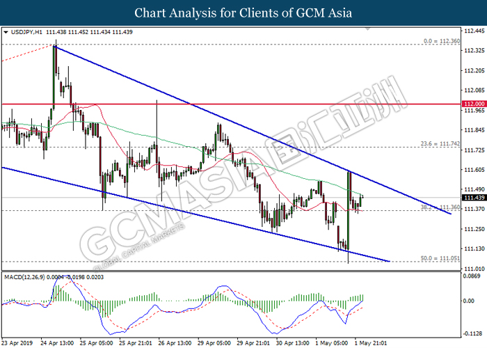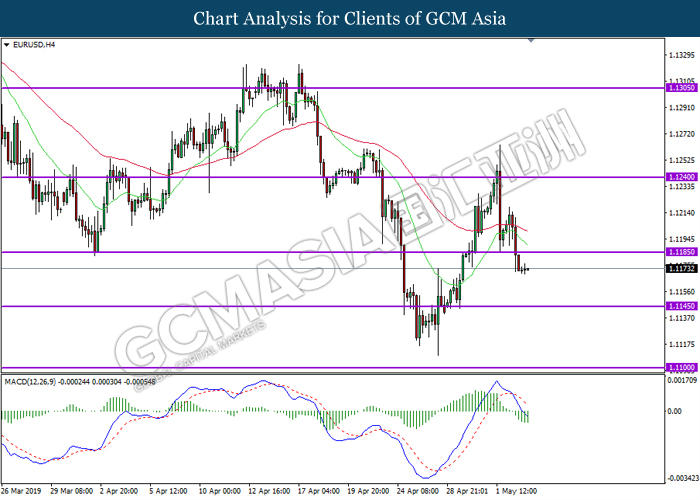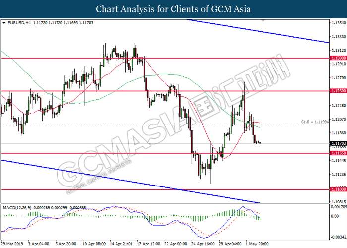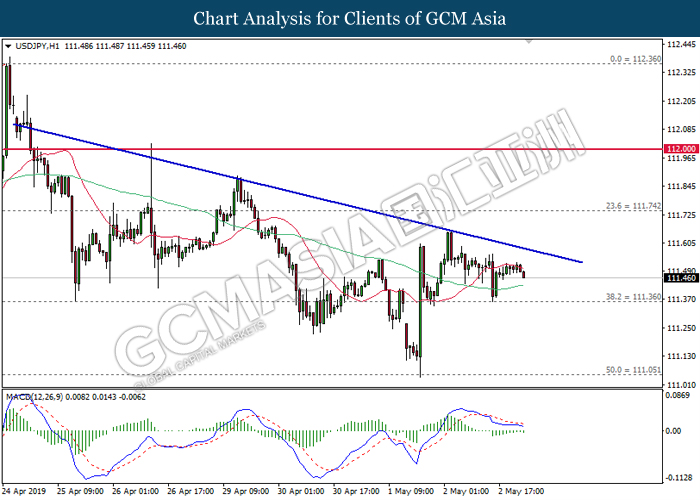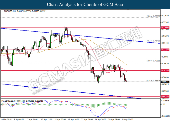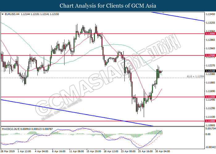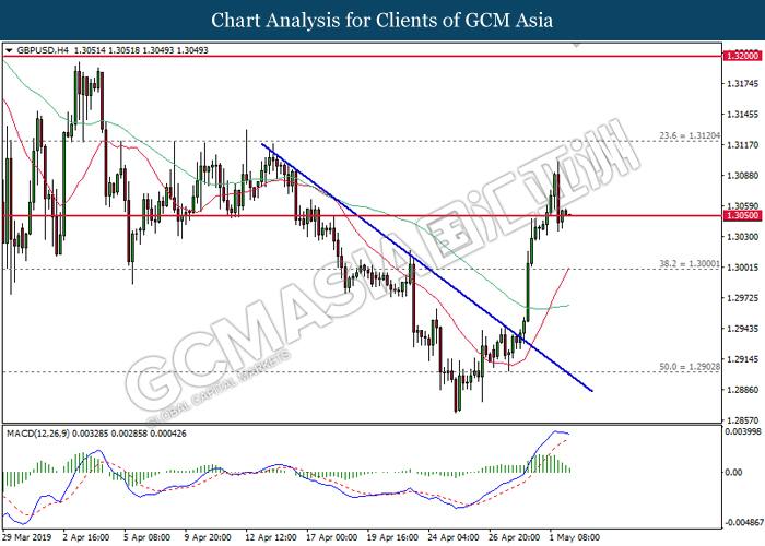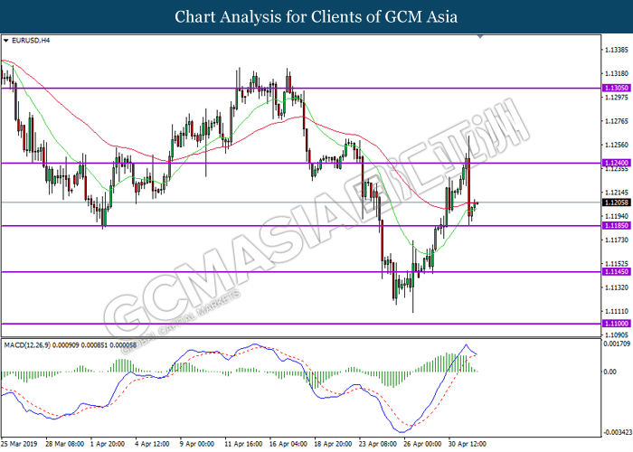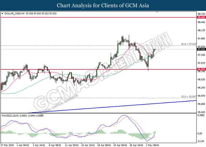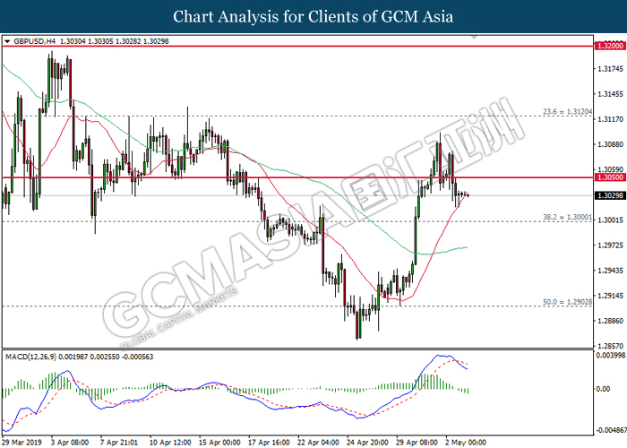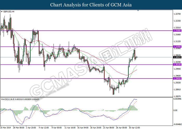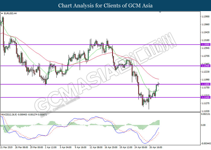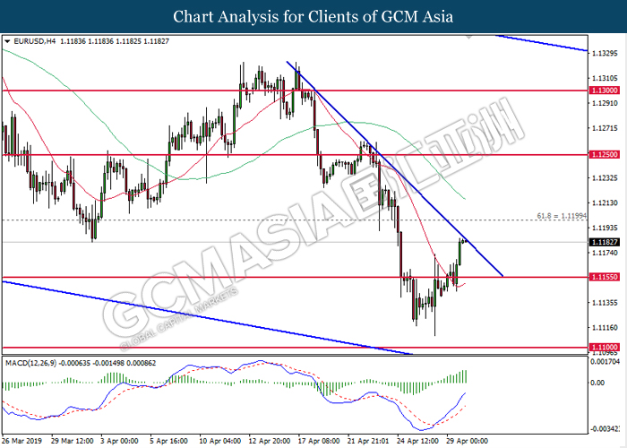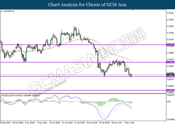 Dollar index continue to fell against its basket of six major currency pairs as market remains pressured by weak consumption figures. Overall, market is currently digesting disappointing data from US after personal consumption expenditures (PCE) (which is the Fed’s preferred inflation measurement) fell to 1.6%, missing economist expectation for a rise of 1.7%. As the Federal Open Market Committee meeting is expected to be held this week, investors’ attention will be centered towards the meeting and Fed Chairman Jerome Powell’s press conference where they expected to result in a decision to leave its key federal funds rate unchanged. Dollar index extend its losses by 0.05% to 97.50 as of writing. On the other hand, AUD/USD suffered huge losses and fell 0.18% to 0.7043 at the time of writing following downbeat China PMI. According to Markit Economics, China factory activity have slumped to 50.2, weaker than market expectation with the expected reading of 51.0. The below-forecasted data have illustrate that China’s economy have barely expanded in April, hinting economic slowdown, therefore dragging the Aussie which is China’s largest trading partner.