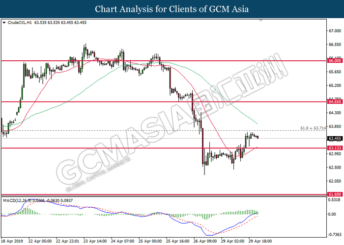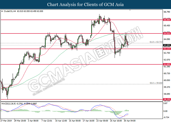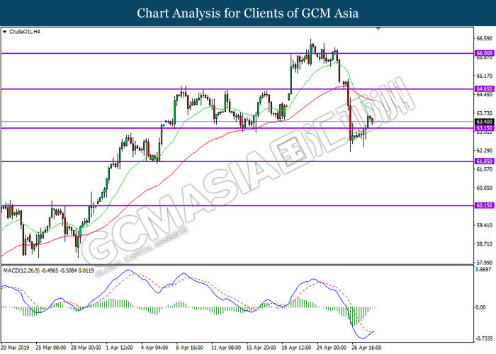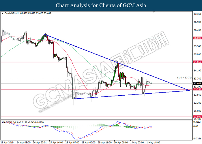 CrudeOIL, H1: Crude oil price was traded lower following prior retracement from the resistance of 63.70. MACD which illustrate diminished bullish momentum suggests its prices to be traded lower, towards the direction of 63.15.