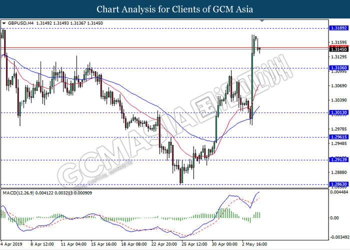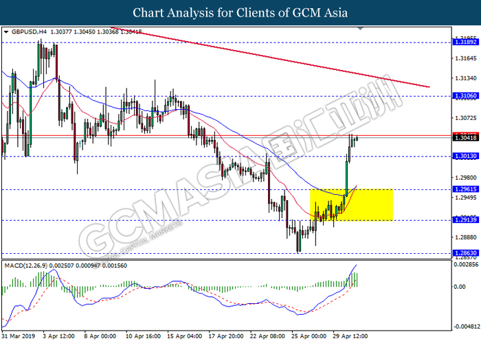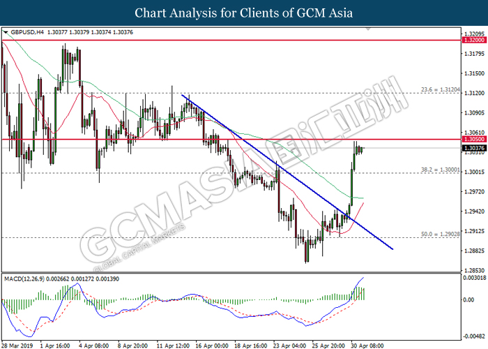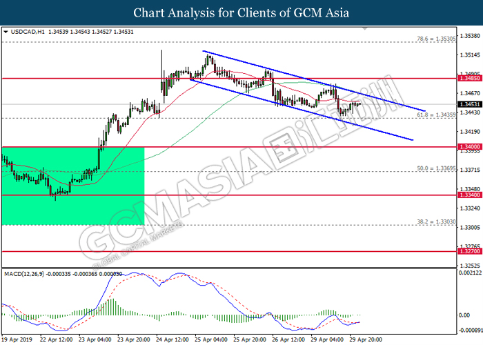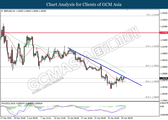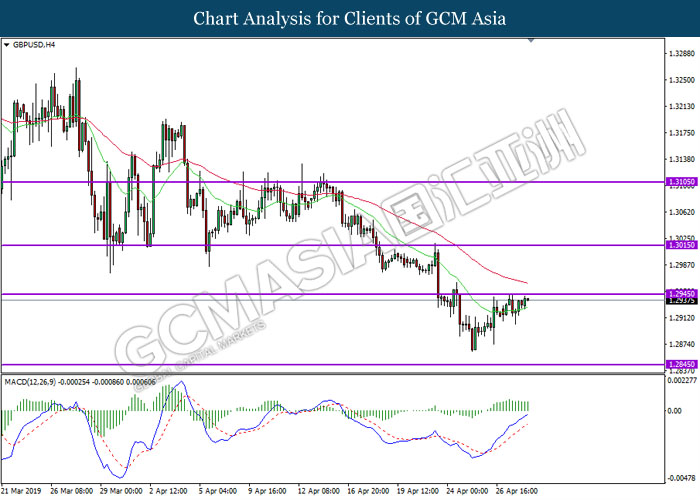 US dollar extended its losses on yesterday as recent data shows diminishing pace of US inflationary pressure. As of writing, the dollar index was quoted down 0.16% to 97.52 during Asian trading session. According to US Bureau of Economic Analysis, its Core PCE Price Index for the month of March slowed down to 1.6%, missing economist forecast for a rise of 1.7%. The data has further cemented Fed’s course to keep interest rate unchanged while continues to scrutinize future economic data before initiating a change in monetary policy stance. However, losses on the greenback were somehow limited after Consumer Spending (which accounts for more than two-third of US economic activity) rose 0.9% last month, beating economist forecast of 0.7%. On the other hand, pair of GBP/USD ticked up 0.02% to 1.2931. Sterling received some bullish bids on yesterday amid reports of cross-party talks between US lawmaker with regards to Brexit has been “productive” and constructive”. Positive development with regards to Brexit has bring in some optimism towards the UK market.