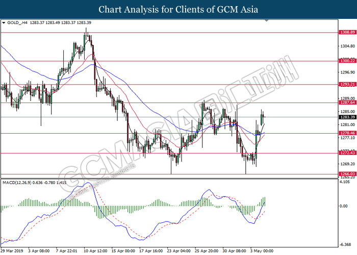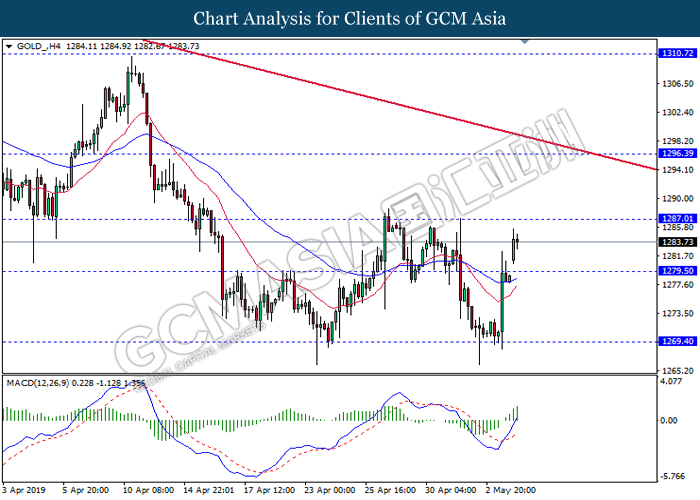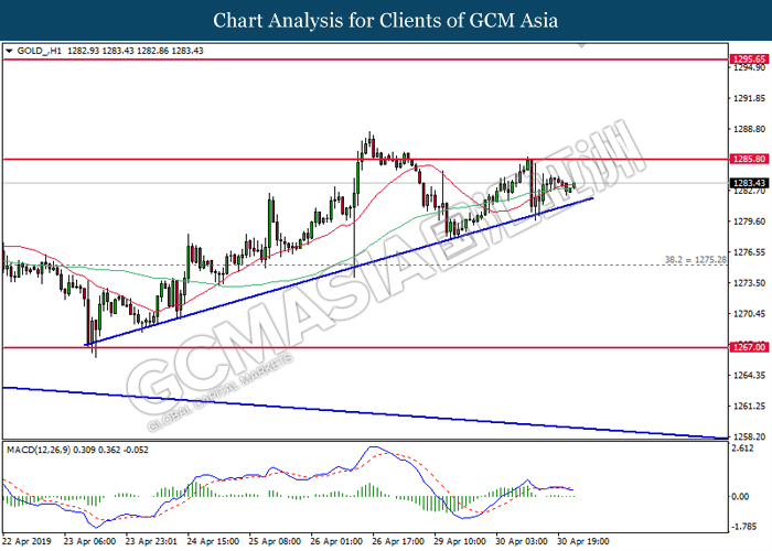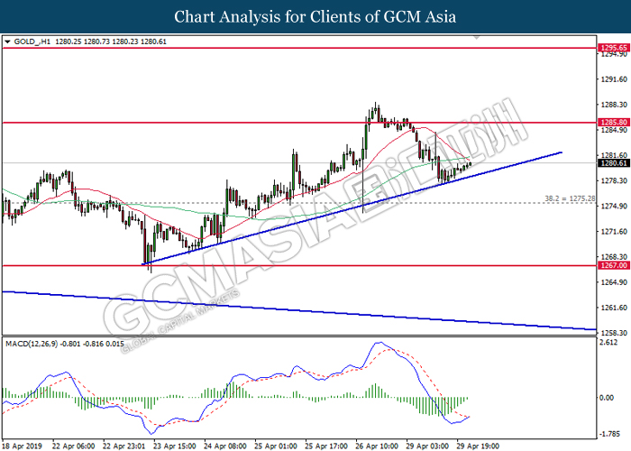 GOLD_, H1: Gold price was traded higher following prior rebound from the upward trendline. MACD which illustrate diminishing downward momentum suggests its prices to be traded higher, towards the direction of 1285.80.