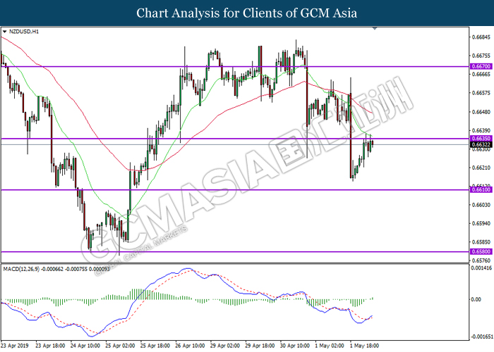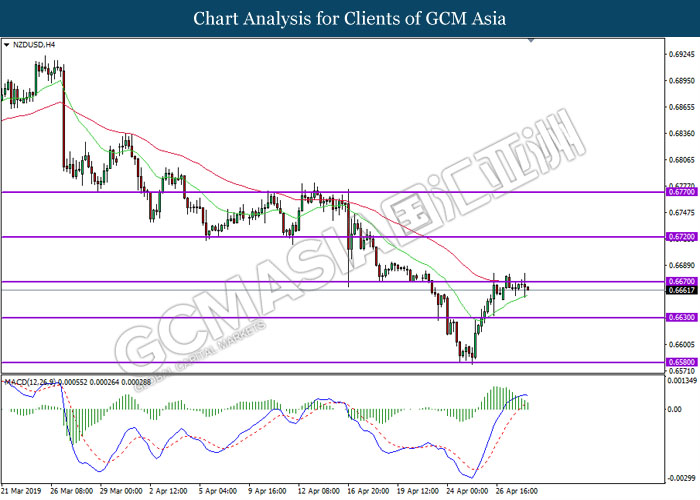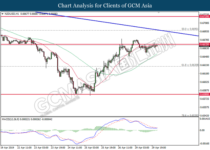 NZDUSD, H1: NZDUSD was traded flat while currently testing near the resistance of 0.6670. MACD which illustrate diminished downward momentum suggests the pair to extend its gains after closing above 0.6670.
