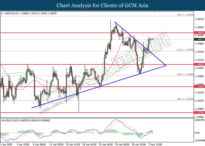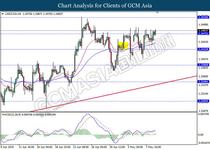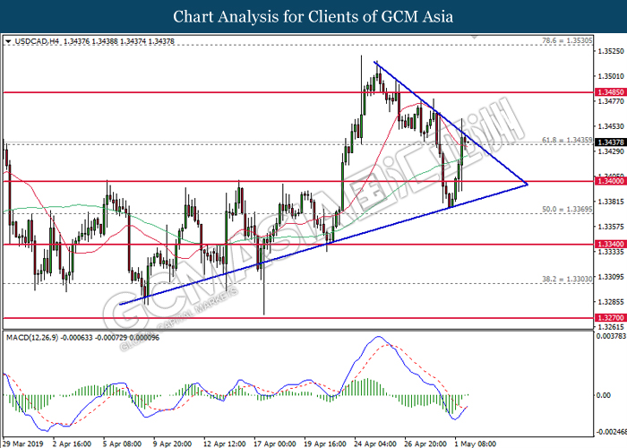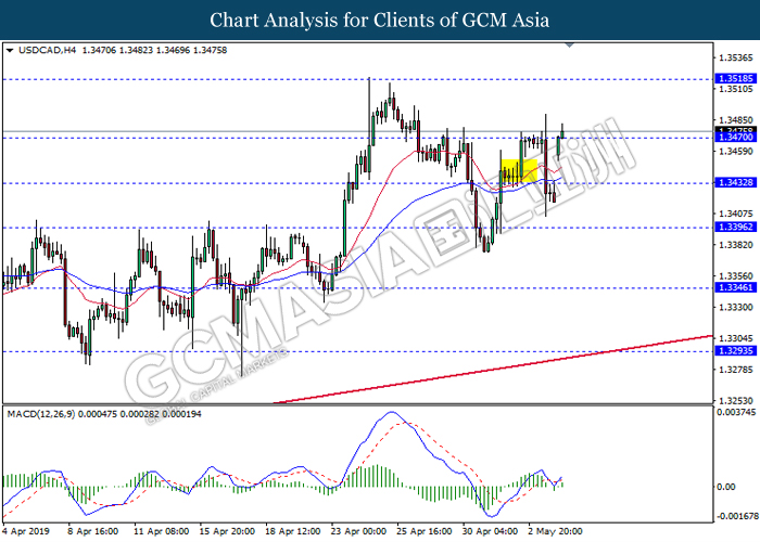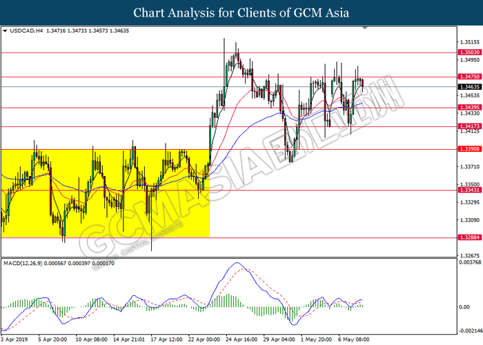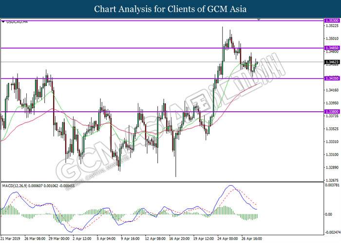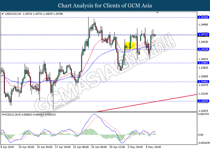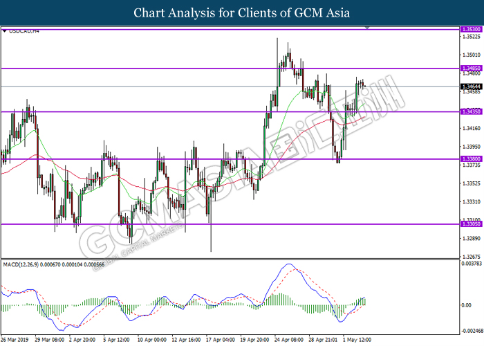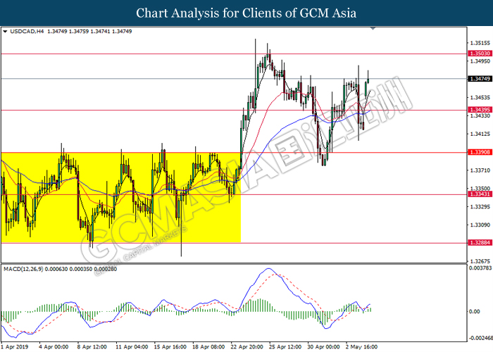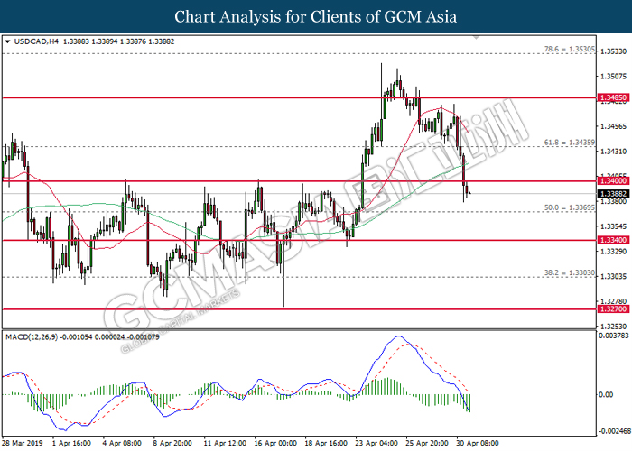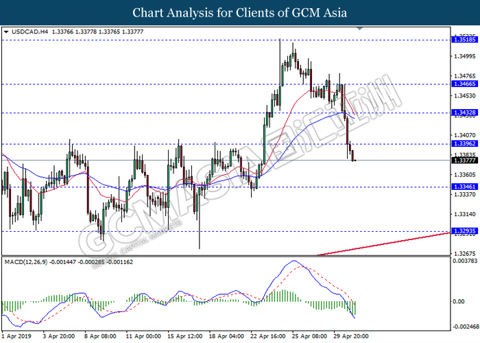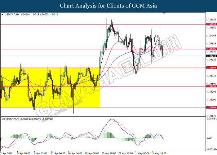USDCAD, H4: USDCAD was traded lower following prior close below the support of 1.3400. MACD which illustrate bearish signal suggests the pair to extend its losses, towards the direction of 1.3370.