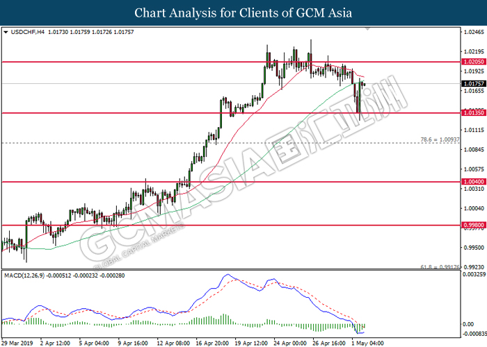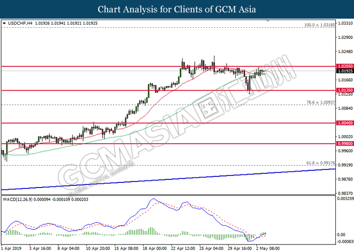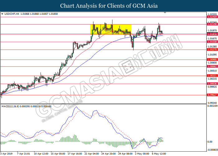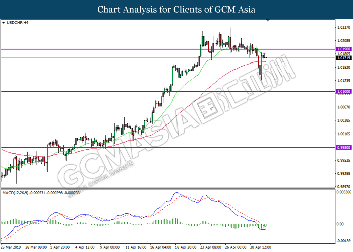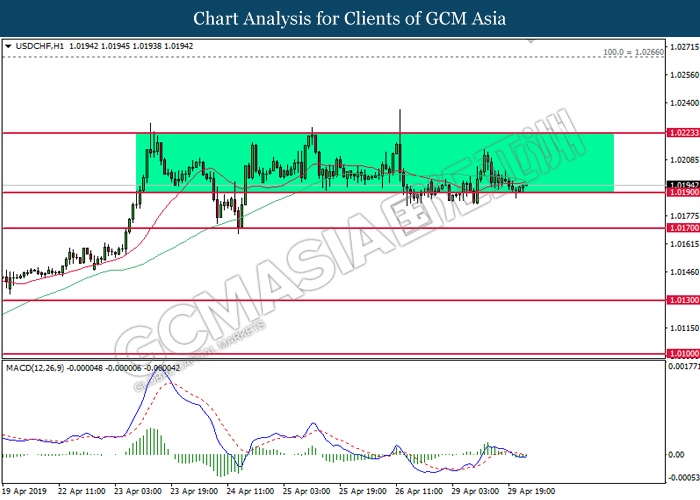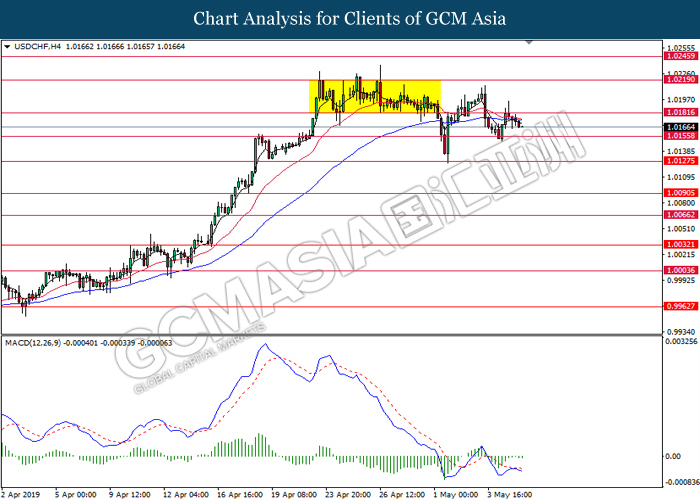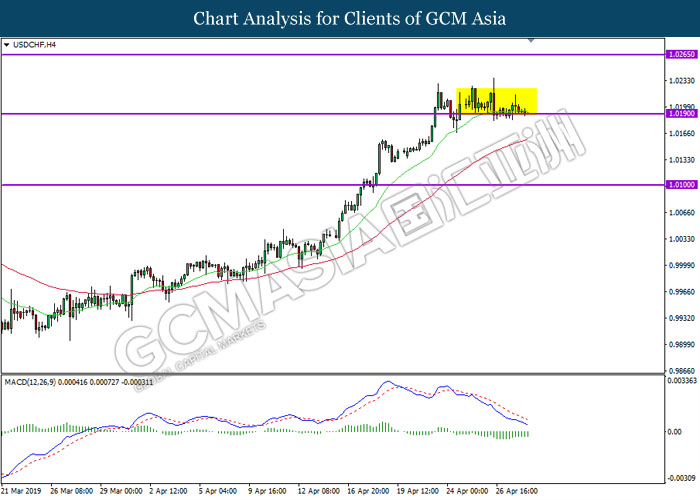 USDCHF, H4: USDCHF was traded flat near the support level 1.0190. MACD which illustrate bearish momentum suggest the pair to extend its losses after successfully breaking below the support level.