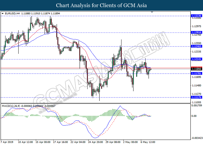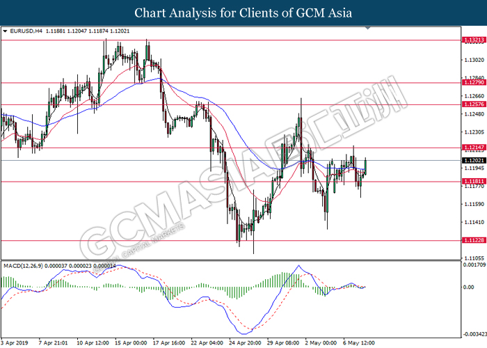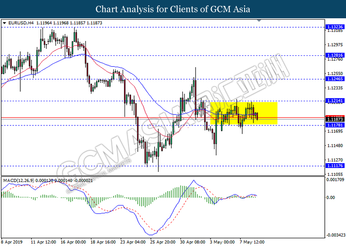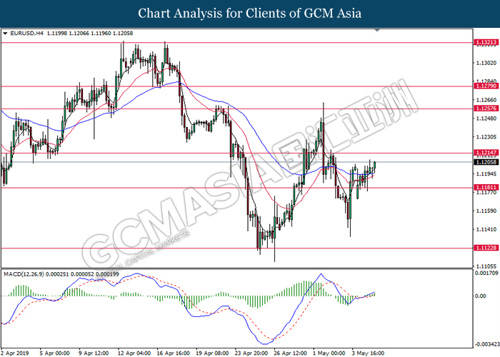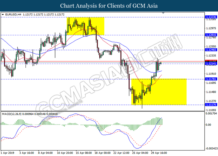EURUSD, H4: EURUSD was traded higher following prior close above 1.1200. MACD which illustrate bullish signal suggests the pair to advance further up, towards the direction of target at 1.1250.