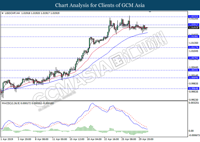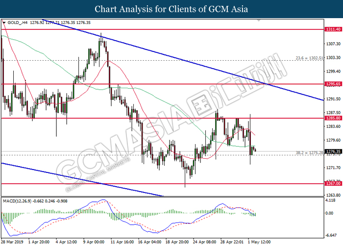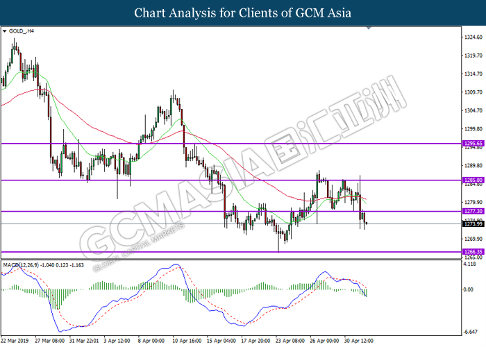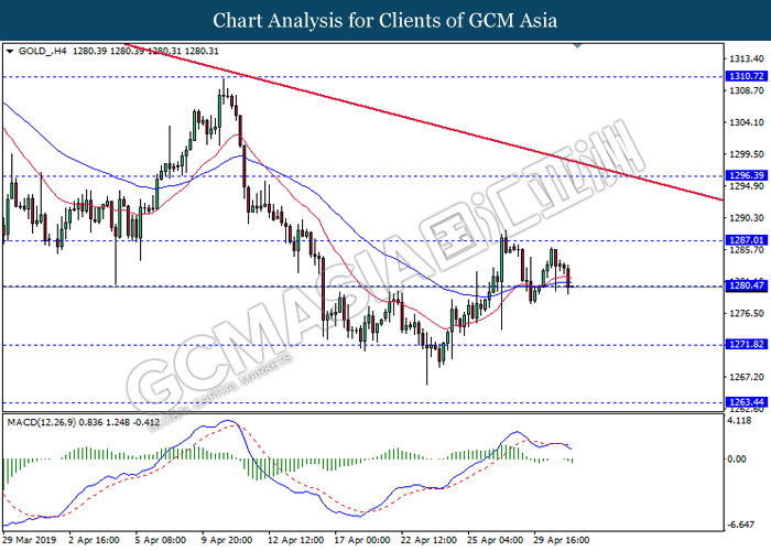 As for commodities, crude oil price advanced up by 0.05% to $63.49 per barrel. Oil price managed to recovered some losses on yesterday as US sanction against Iran will be enforced fully on May 2nd, cutting off supplies from OPEC’s No. 4 producer. On the other hand, gold price ticks up 0.04% to $1,280.29 a troy ounce following weaker greenback.