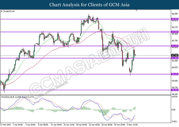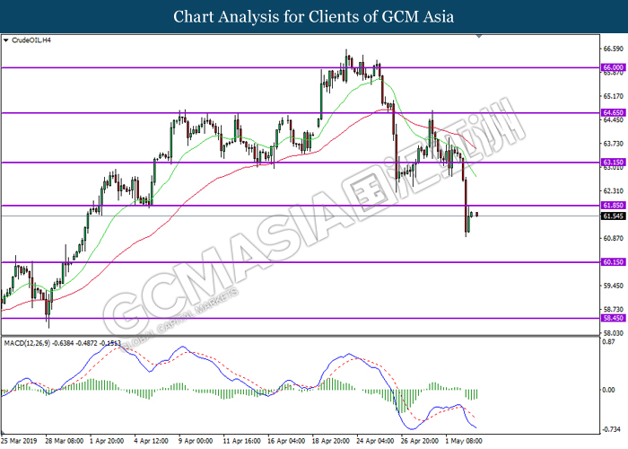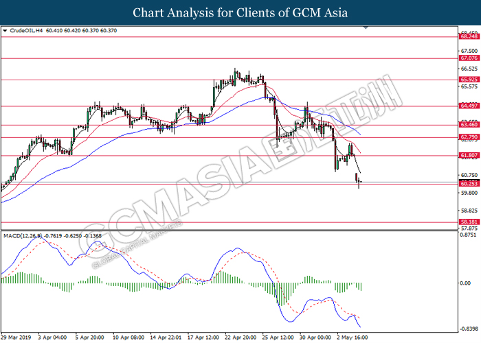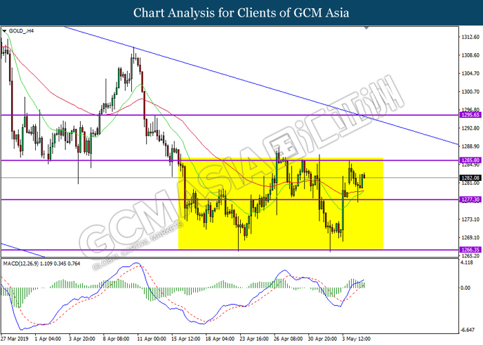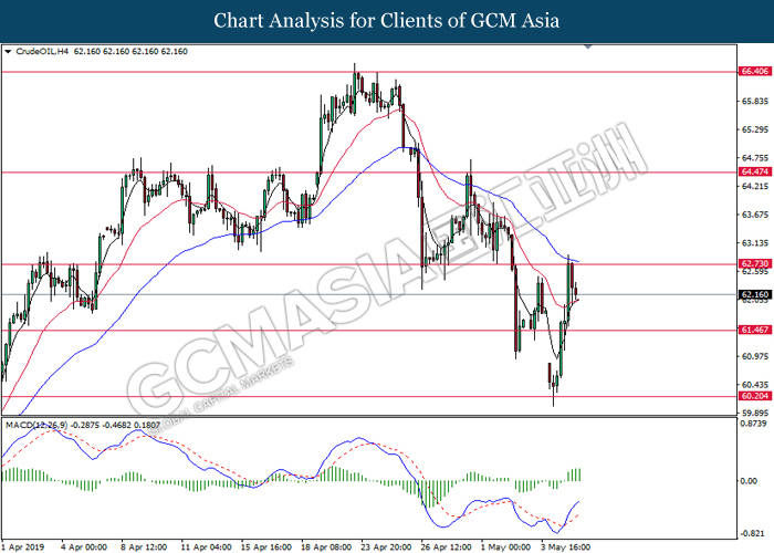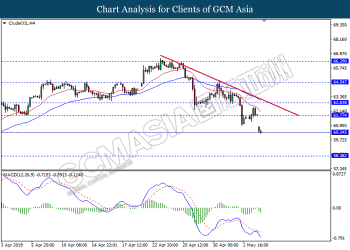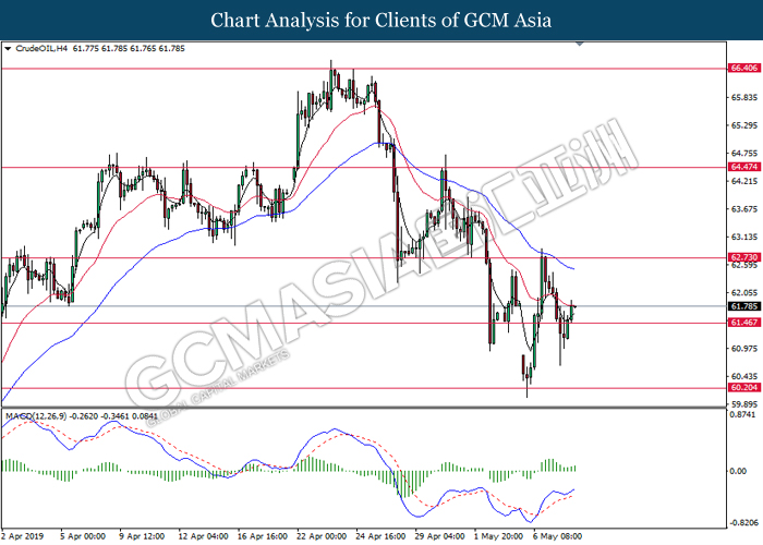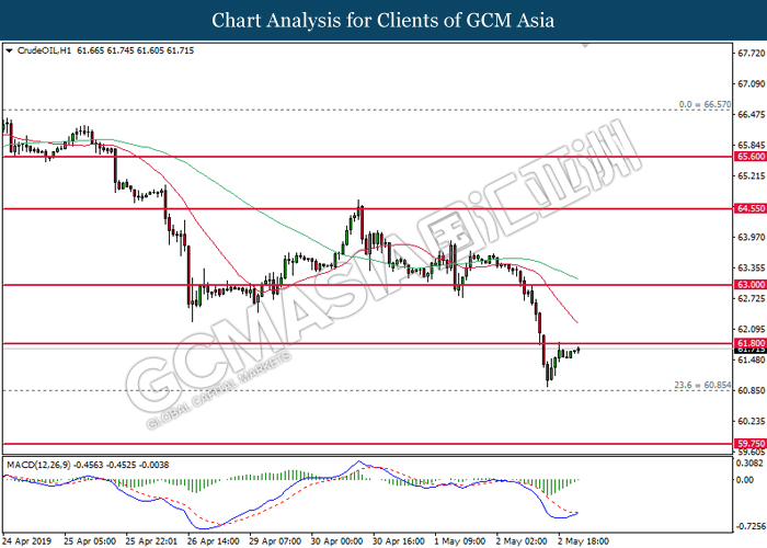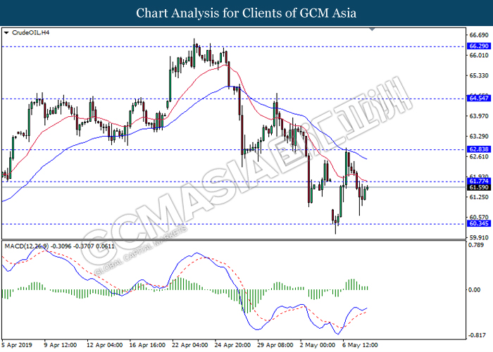 As for commodities, crude oil price dips 0.52% to $61.63 per barrel at the time of writing despite crude inventories draw surprise. According to EIA, inventory level have slumped by -3.963M which is better than market expectation with an inventory rise of 1.125M. However, market remains pessimistic as the sentiment was capped by worries that a breakdown in trade talks between the world’s top two economies will drag global growth lower which could affected the demand for the commodity, therefore pressuring the commodity price. On the other hand, gold price have also slip 0.12% to $1280.71 a troy ounce as of writing following investor have dumped on the commodity on profit taking.