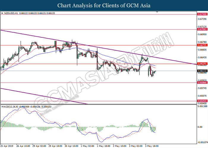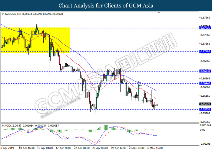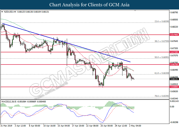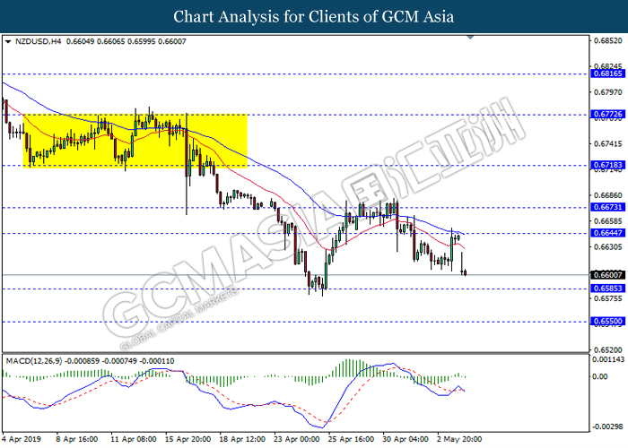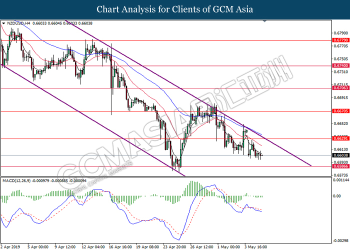 NZDUSD, H4: NZDUSD was traded lower following prior retracement from the downward trendline. MACD which begins to form a death cross signal suggests the pair to advance further down, towards the direction of 0.6630.