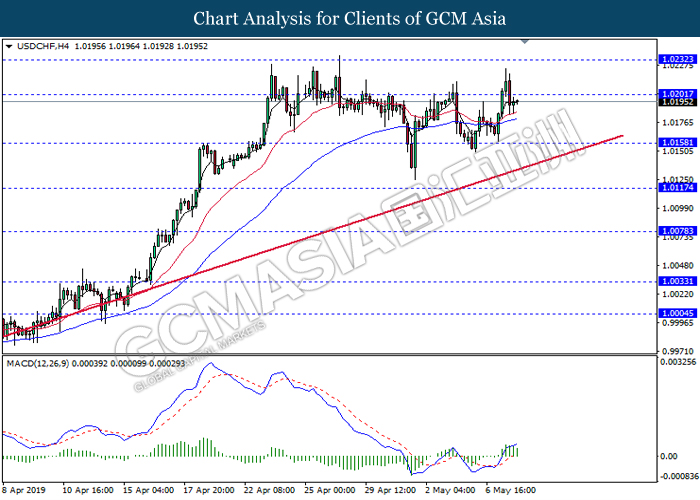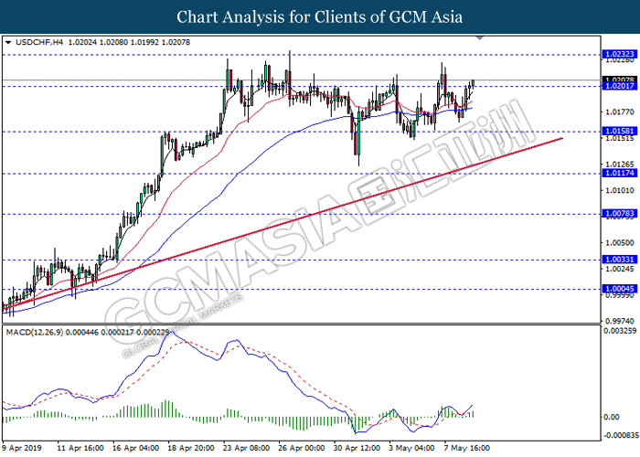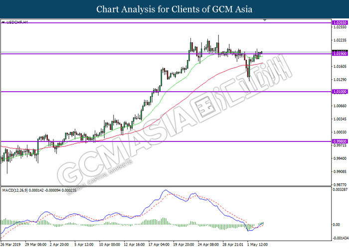 USDCHF, H1: USDCHF remains traded within a sideways channel following prior rebound from the bottom level. MACD which illustrate diminished bearish momentum suggests the pair to be traded higher in short-term, towards the direction of 1.0225.