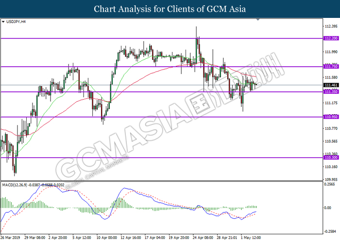 USDJPY, H4: USDJPY was traded higher following prior rebound from the support at 111.25. MACD which illustrate diminished downward momentum suggests the pair to be traded higher in short-term as technical correction.