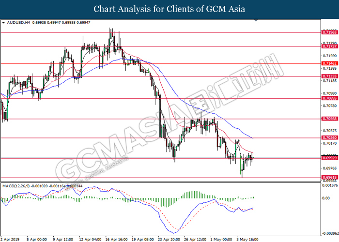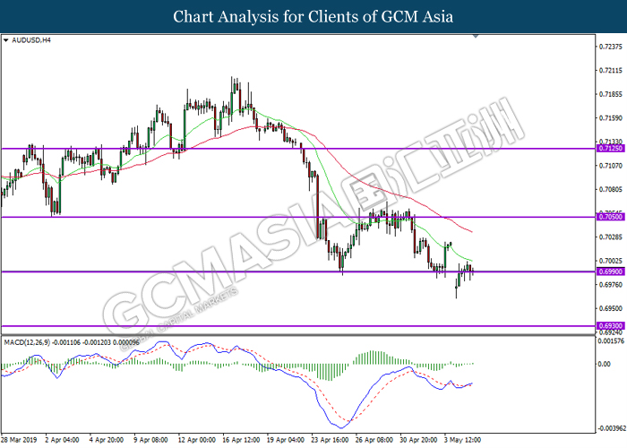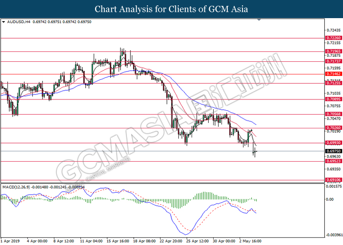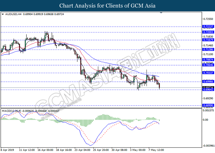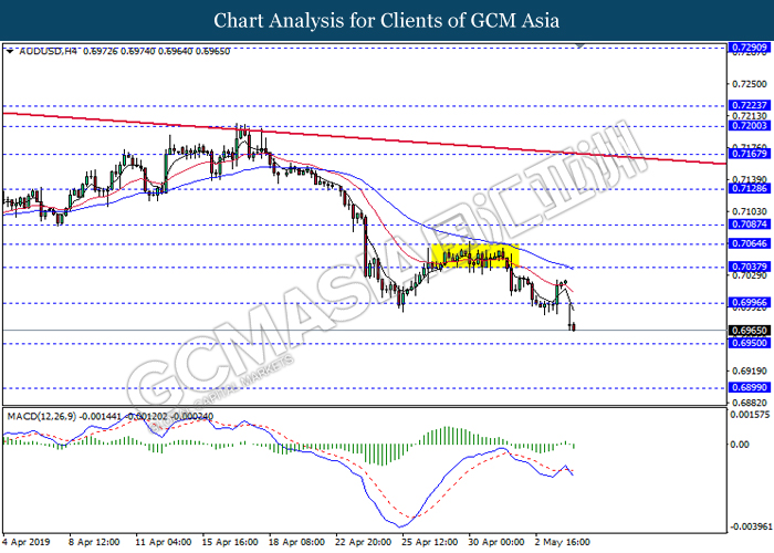 AUDUSD, H4: AUDUSD was traded lower while currently testing near the support level 0.6965. MACD which illustrate bearish bias signal with the formation of death cross suggest the pair to extend its losses after it breaks below the support level 0.6965.