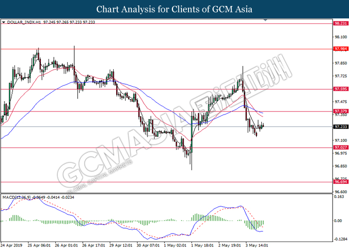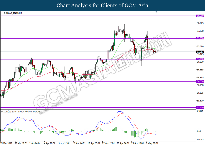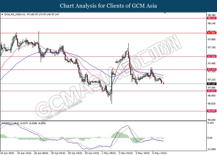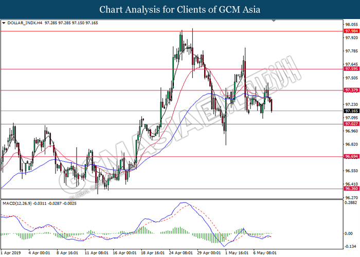 DOLLAR_INDX, H4: Dollar index was traded lower following prior retracement from the resistance level at 97.40. MACD which illustrate bearish momentum and the formation of death cross suggest the index to extend its losses toward the support level at 97.05.