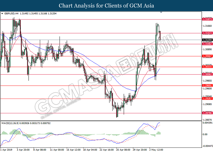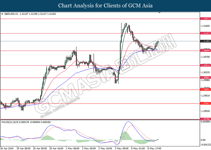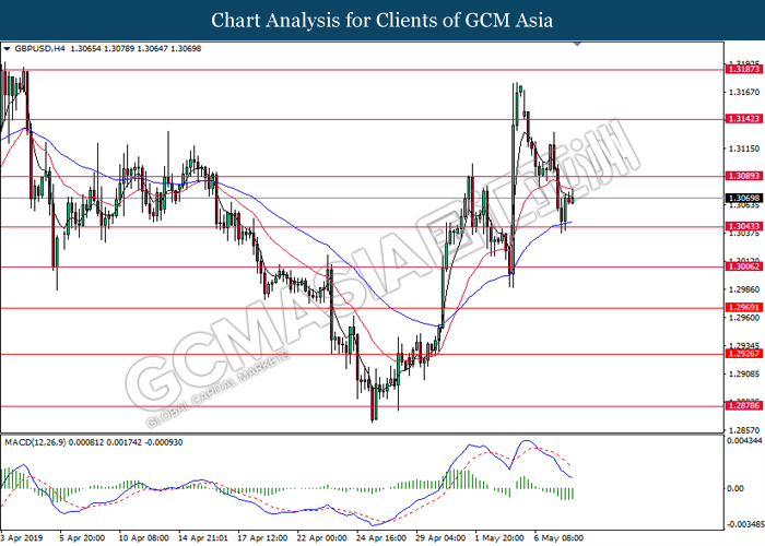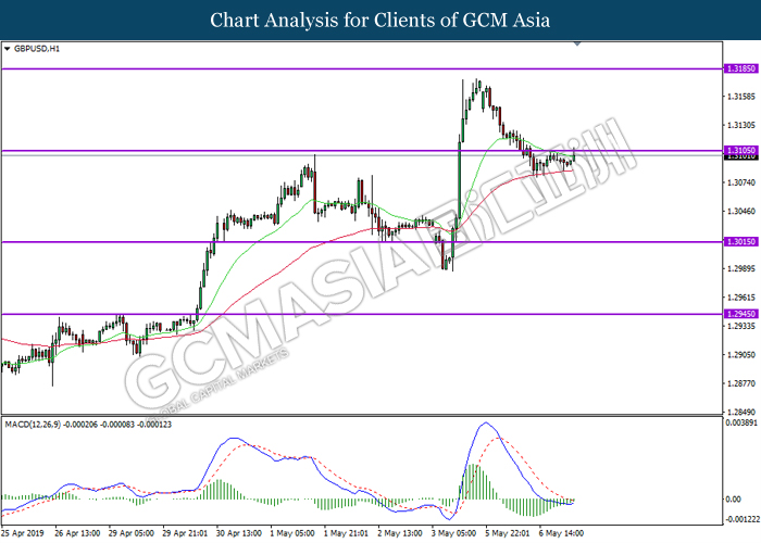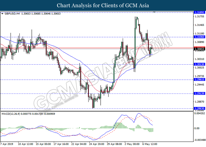 GBPUSD, H4: GBPUSD was traded higher following prior rebound from the MA line 50 (blue). MACD which illustrate diminishing bearish momentum suggest the pair to extend its rebound towards the resistance level 1.3105.
