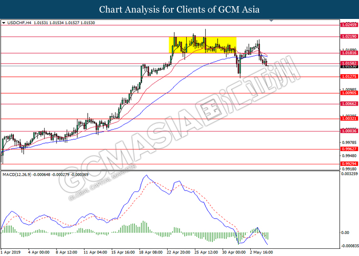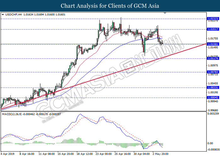 USDCHF, H4: USDCHF was traded lower while currently testing the support level at 1.0180. MACD which display diminishing bullish momentum suggest the pair to extend its losses after successfully breakout below the support level at 1.0180.