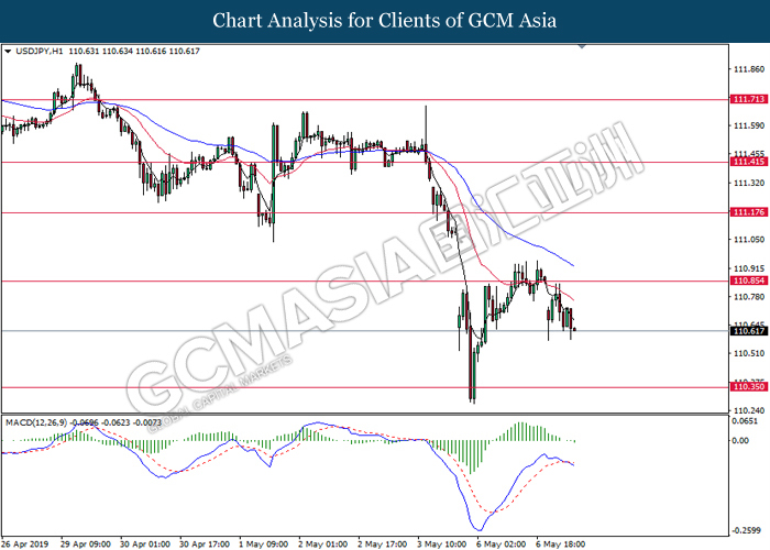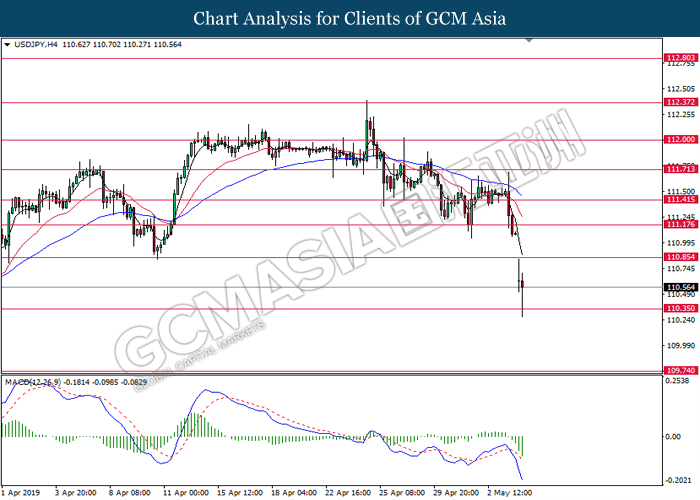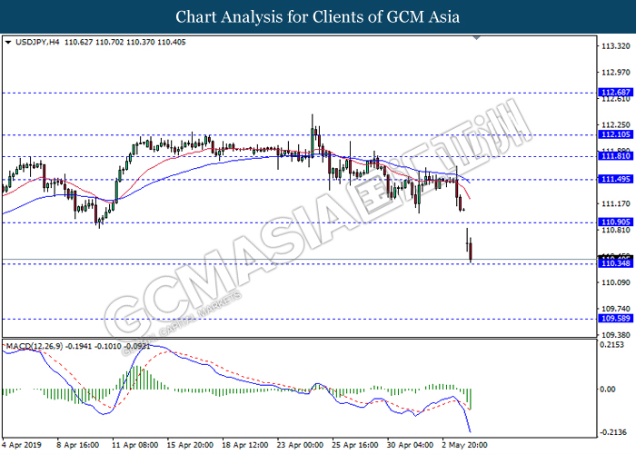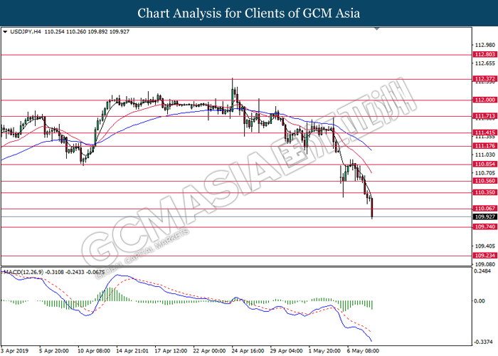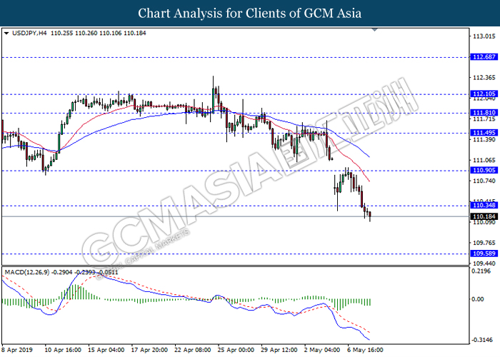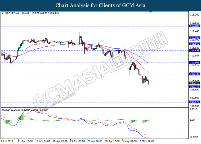 USDJPY, H4: USDJPY was traded lower following prior breakout below the previous support level at 110.05. MACD which display bearish signal suggest the pair to extend its losses toward the support level at 109.75.