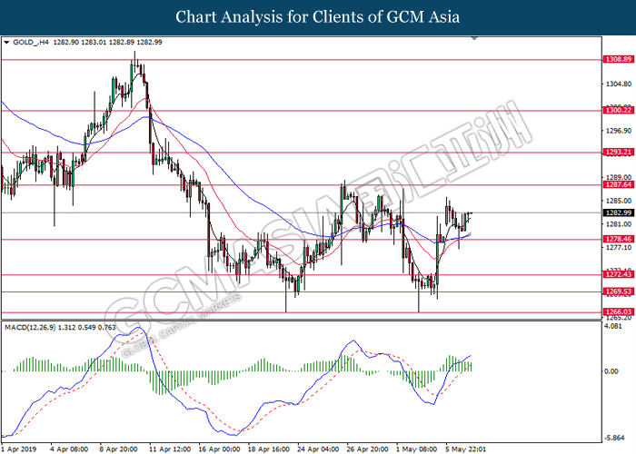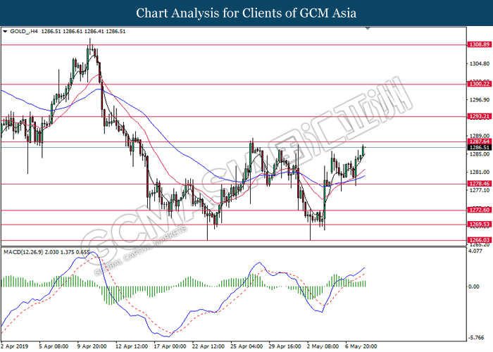 GOLD_, H4: Gold was traded higher following prior rebound from the 20 moving average line (Red). MACD which illustrate bullish bias momentum suggest the commodity to extend its gains toward the resistance level at 1287.65.