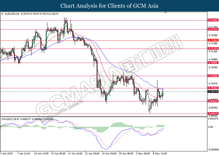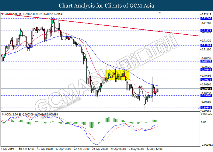 AUDUSD, H4: AUDUSD was traded higher following prior rebound from the 20 moving average line (Red). MACD which illustrate bullish bias momentum and the formation of golden cross suggest the pair to extend it gains toward the resistance level at 0.7025.
