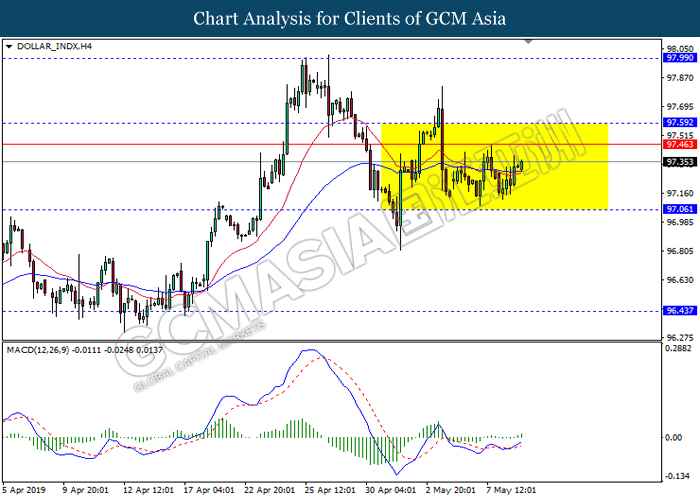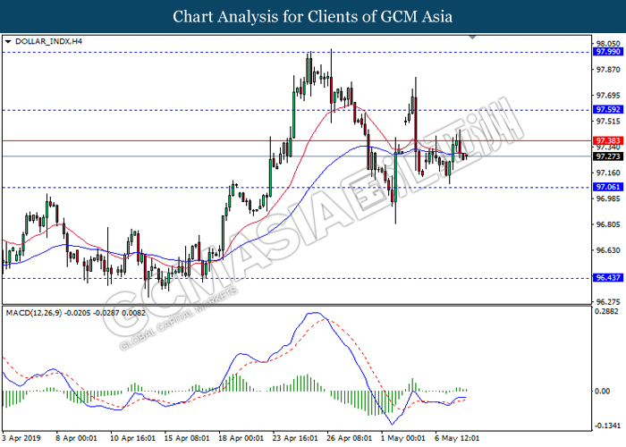 DOLLAR_INDX, H4: Dollar index remain traded flat following recent rebound from the low levels. However, MACD which illustrate bullish momentum signal with the formation of golden cross suggest the dollar to be traded higher in short term towards the resistance level 97.60