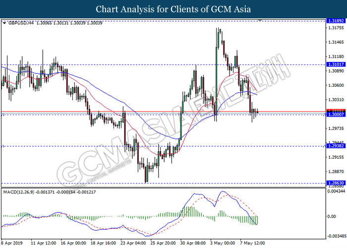 GBPUSD, H4: GBPUSD was traded lower while currently testing the support level 1.3000. However, MACD which illustrate diminishing bearish momentum suggest the pair to experience a technical correction in short term towards the resistance level 1.3100.