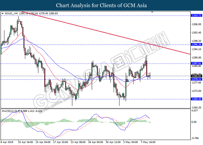 GOLD_, H4: Gold price was traded lower while currently testing near the support level 1279.10. MACD which illustrate bearish bias signal with the formation of death cross suggest the commodity to extend its losses after it breaks below the support level.