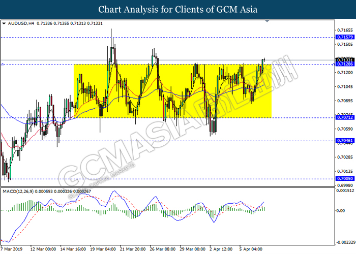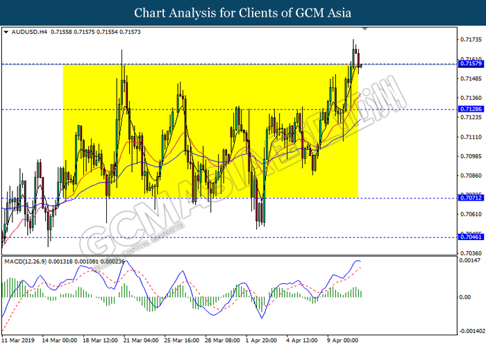 AUDUSD, H4: AUDUSD was traded higher following prior rebound from the support near 0.7115. MACD which illustrate bullish signal suggests the pair to extend its gains, towards the direction of 0.7130.